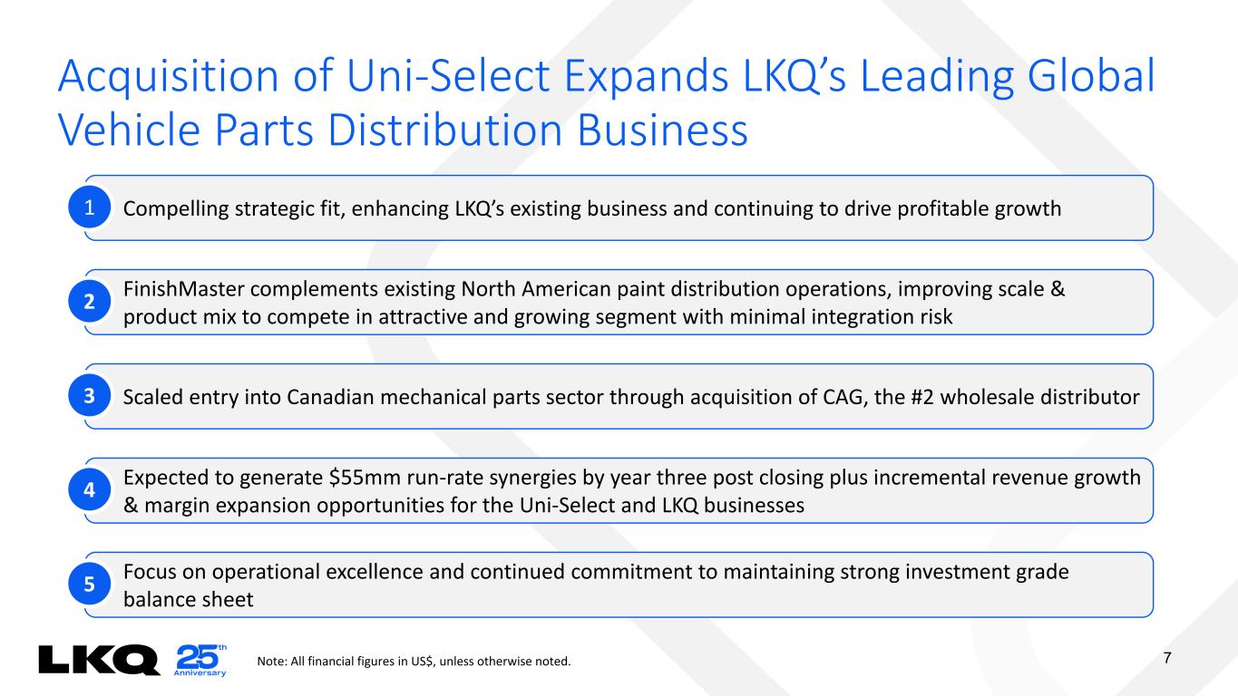 Acquisition of Uni-Select Expands LKQ’s Leading Global Vehicle Parts Distribution Business Compelling strategic fit, enhancing LKQ’s existing business and continuing to drive profitable growth1 FinishMaster complements existing North American paint distribution operations, improving scale & product mix to compete in attractive and growing segment with minimal integration risk 2 Scaled entry into Canadian mechanical parts sector through acquisition of CAG, the #2 wholesale distributor 3 Expected to generate $55mm run-rate synergies by year three post closing plus incremental revenue growth & margin expansion opportunities for the Uni-Select and LKQ businesses 4 7Note: All financial figures in US$, unless otherwise noted. Focus on operational excellence and continued commitment to maintaining strong investment grade balance sheet 5