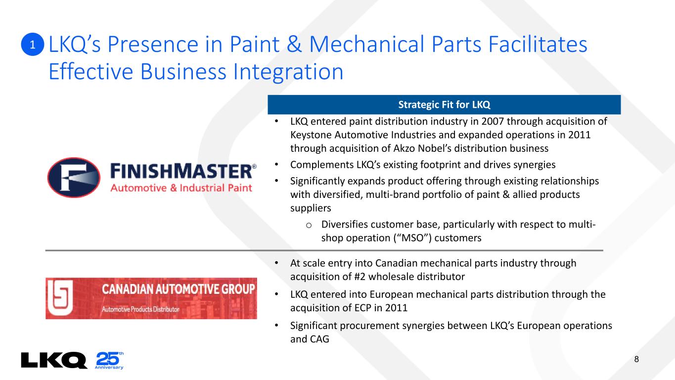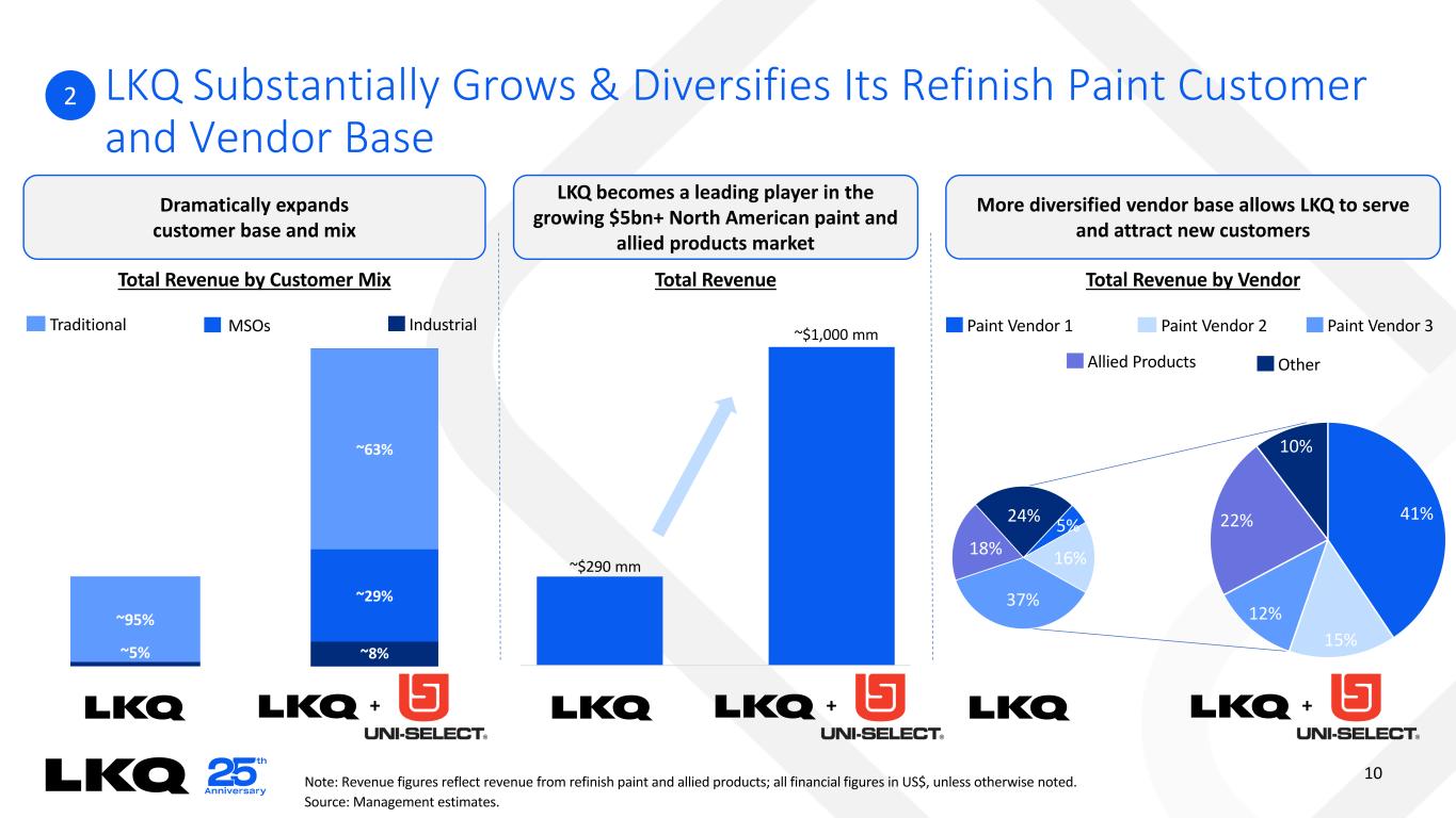 10 LKQ Substantially Grows & Diversifies Its Refinish Paint Customer and Vendor Base Note: Revenue figures reflect revenue from refinish paint and allied products; all financial figures in US$, unless otherwise noted. Source: Management estimates. 2 Total Revenue ~$290 mm ~$1,000 mm Total Revenue by Customer Mix Total Revenue by Vendor Paint Vendor 1 Paint Vendor 2 Paint Vendor 3 Allied Products Other + 5% 16% 37% 18% 24% Dramatically expands customer base and mix LKQ becomes a leading player in the growing $5bn+ North American paint and allied products market More diversified vendor base allows LKQ to serve and attract new customers 41% 15% 12% 22% 10% MSOsTraditional Industrial ~5% ~95% ~8% ~29% ~63% + +