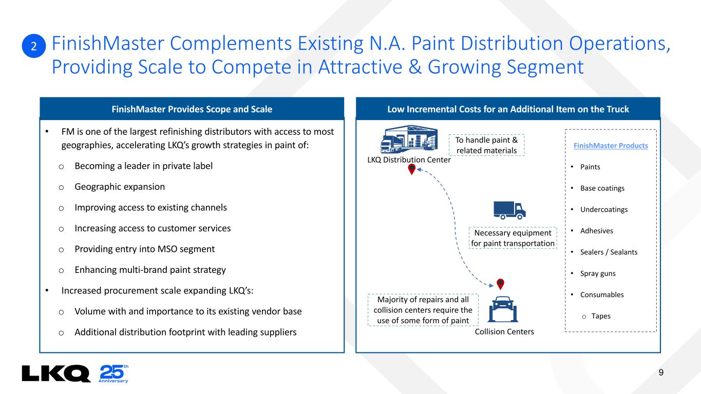 LKQ’s Presence in Paint & Mechanical Parts Facilitates Effective Business Integration 8 1 Strategic Fit for LKQ • LKQ entered paint distribution industry in 2007 through acquisition of Keystone Automotive Industries and expanded operations in 2011 through acquisition of Akzo Nobel’s distribution business • Complements LKQ’s existing footprint and drives synergies • Significantly expands product offering through existing relationships with diversified, multi-brand portfolio of paint & allied products suppliers o Diversifies customer base, particularly with respect to multi- shop operation (“MSO”) customers • At scale entry into Canadian mechanical parts industry through acquisition of #2 wholesale distributor • LKQ entered into European mechanical parts distribution through the acquisition of ECP in 2011 • Significant procurement synergies between LKQ’s European operations and CAG