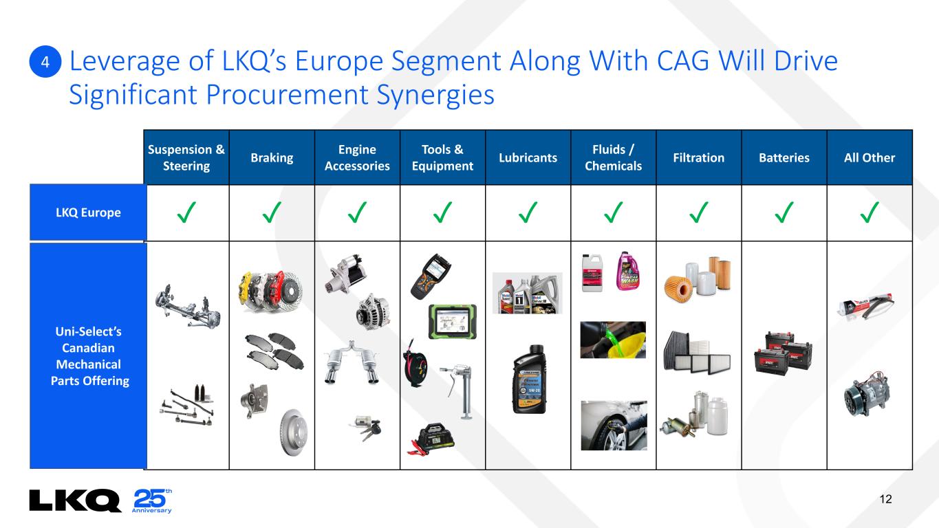 Entry & Expansion Opportunities in Canadian Mechanical Parts Through Acquisition of #2 Wholesale Distributor 11 2.3 2.1 2.3 2.3 2.5 2.6 2.7 2.8 2.9 3.0 3.1 3.2 1.6 1.5 1.6 1.7 1.8 1.9 1.9 2.0 2.0 2.1 2.2 2.3 $5.4 Competitor 1 Others CAG #2 Competitor 2 Competitor 3 3% Canada Retail Hard Parts Segment Canada WD Hard Parts Segment 2019A 2022A2020A 2021A 2023E 2026E 2027E2024E 2025E 2028E 2029E 2030E $4.6 $3.6 $4.9 $3.9 $3.9 $4.0 $4.3 $4.5 $4.8 $5.1 5.3$ 29% 19% 5%3 45% 3 Note: All financial figures in US$, unless otherwise noted. Source: RBC Capital Markets Initiating Coverage report, LKQ Strategy Analysis, and public filings. Opportunity for Expansion Canadian Automotive Aftermarket Distribution ($bn) Estimated Shares for Wholesale Distributors