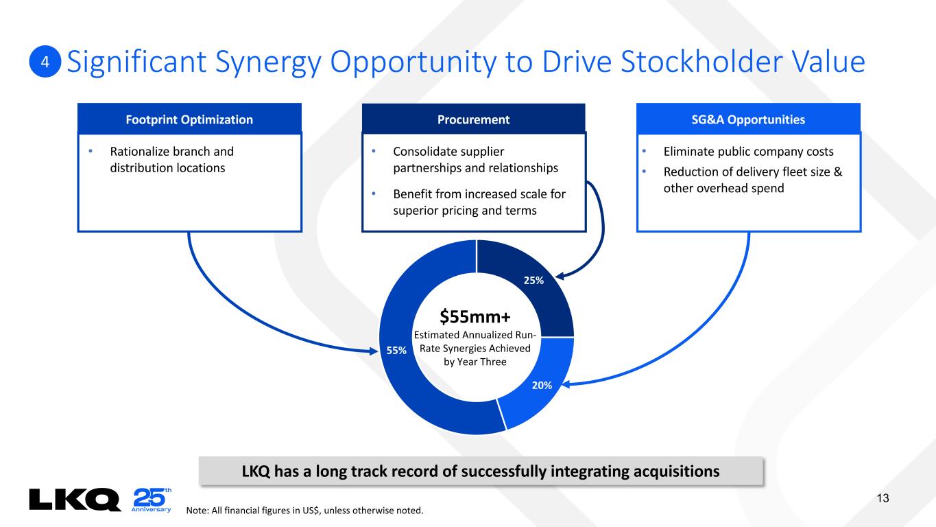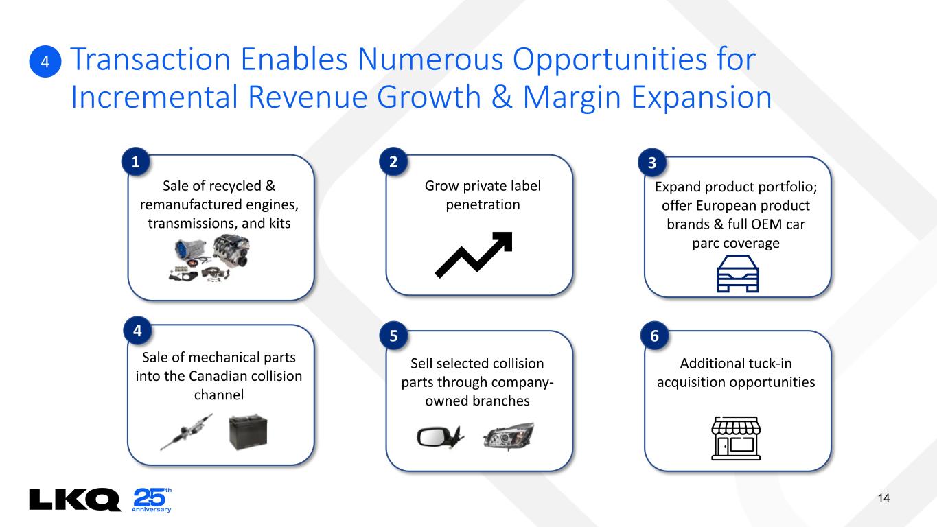 25% 20% 55% $55mm+ Estimated Annualized Run- Rate Synergies Achieved by Year Three • Eliminate public company costs • Reduction of delivery fleet size & other overhead spend • Consolidate supplier partnerships and relationships • Benefit from increased scale for superior pricing and terms • Rationalize branch and distribution locations Note: All financial figures in US$, unless otherwise noted. Footprint Optimization Procurement SG&A Opportunities LKQ has a long track record of successfully integrating acquisitions 4 Significant Synergy Opportunity to Drive Stockholder Value 13