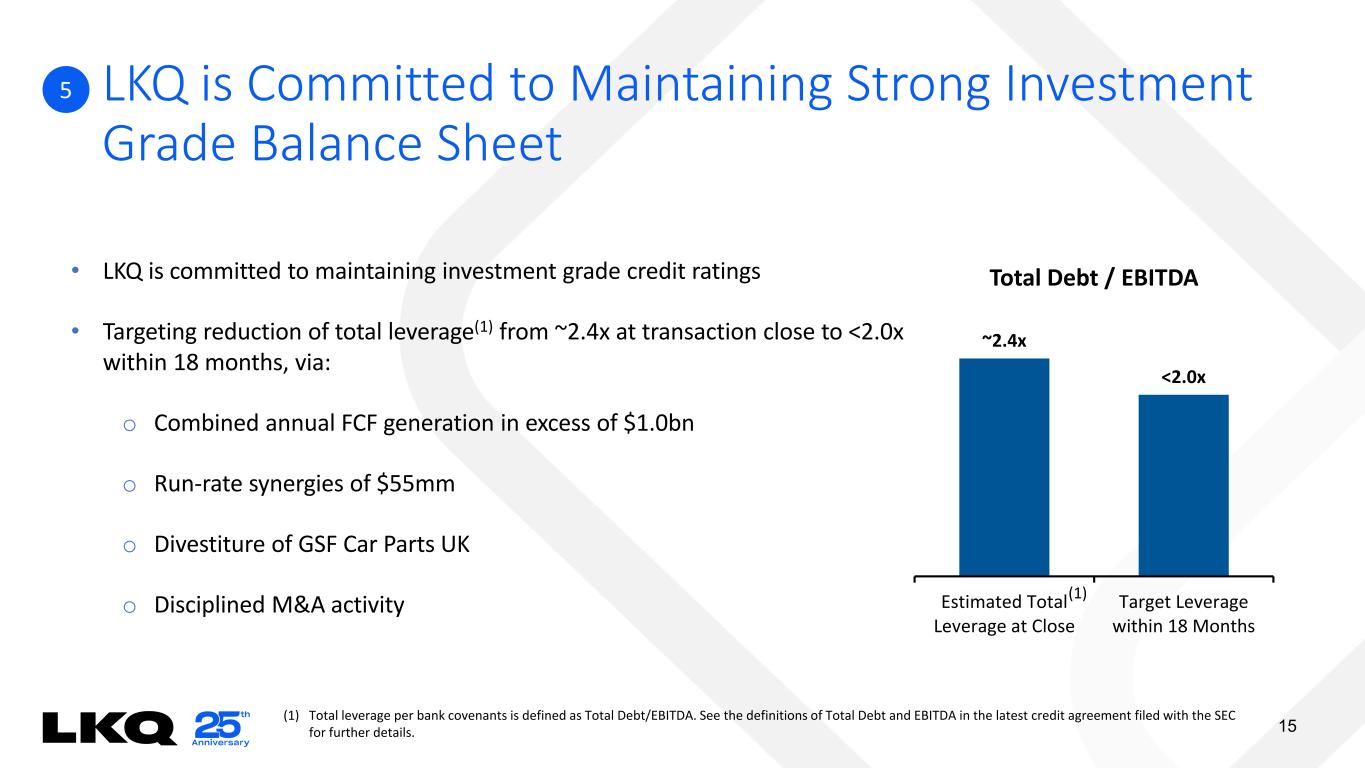 Transaction Enables Numerous Opportunities for Incremental Revenue Growth & Margin Expansion 14 1 2 3 4 6 Sale of recycled & remanufactured engines, transmissions, and kits into Canada Grow private label penetration Expand product portfolio; offer European product brands & full OEM car parc coverage Sale of mechanical parts into the Canadian collision channel Additional tuck-in acquisition opportunities 5 Sell selected collision parts through company- owned branches 4