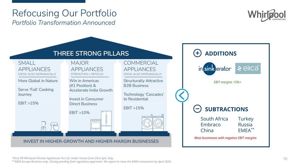 Refocusing Our Portfolio Portfolio Transformation Announced ADDITIONS * EBIT margins 15%+ SUBTRACTIONS South Africa Turkey Embraco Russia ** China EMEA Most businesses with negative EBIT margins *Elica PB Whirlpool Kitchen Appliances Pvt Ltd. Under license from Elica SpA, Italy. 10 **MDA Europe Business only. Closing pending final regulatory approvals. We expect to close the EMEA transaction by April 2024.
