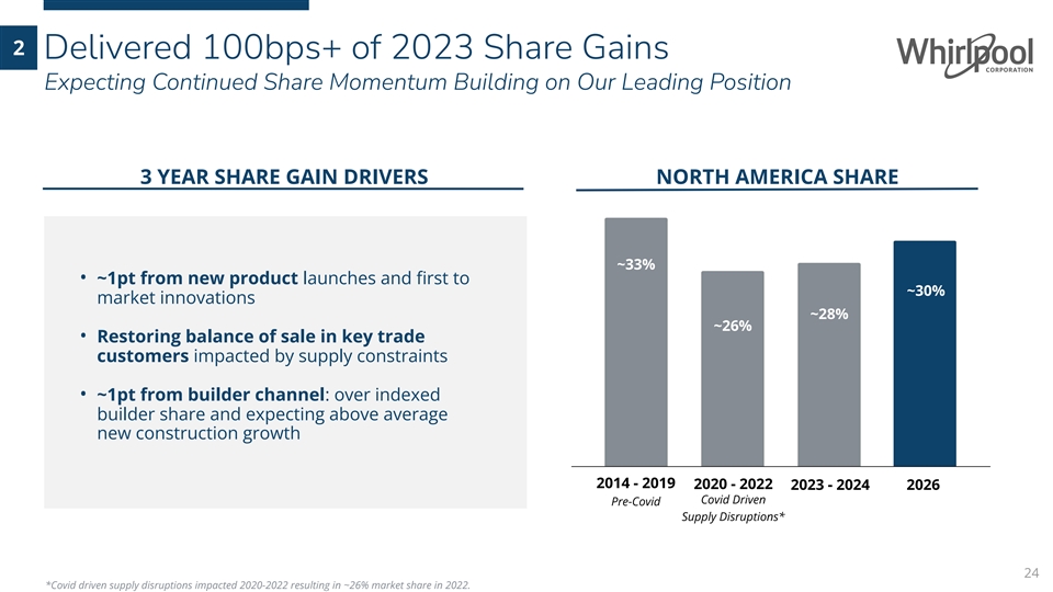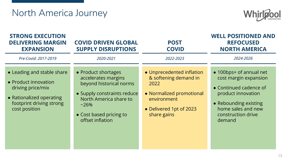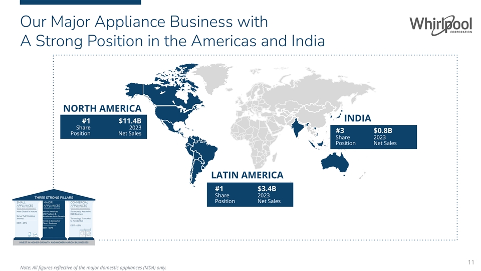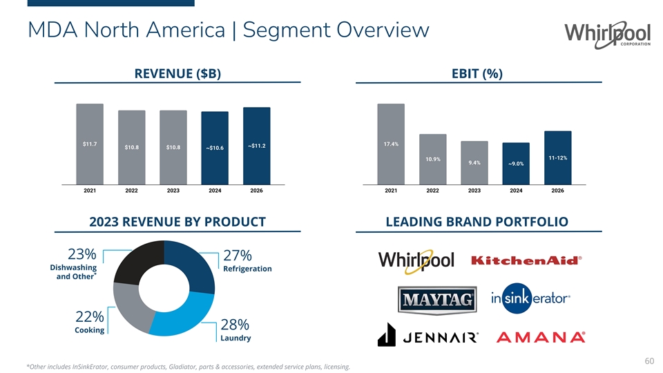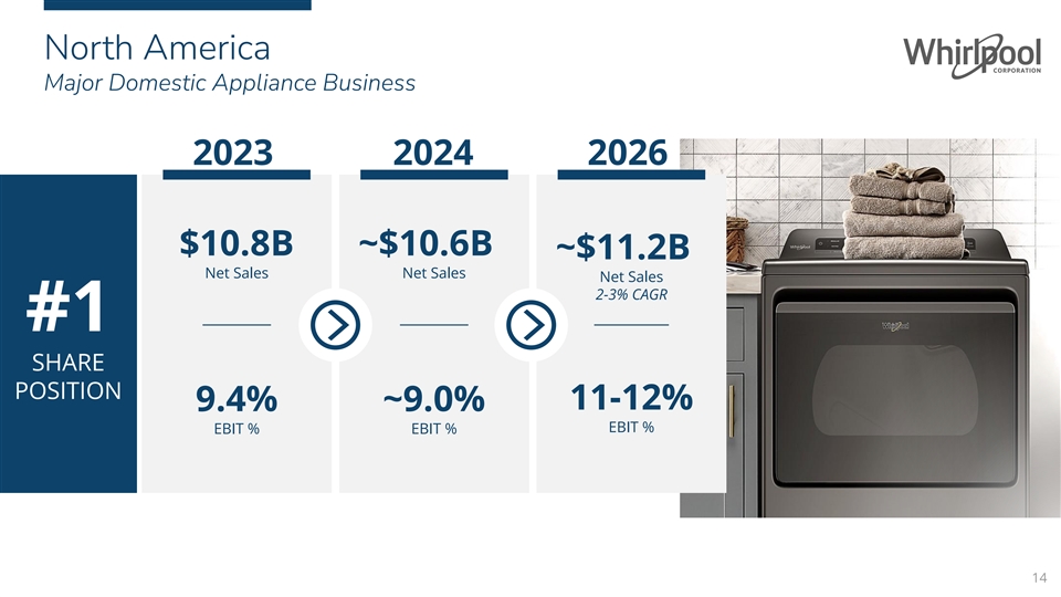 North America Major Domestic Appliance Business 2023 2024 2026 $10.8B ~$10.6B ~$11.2B Net Sales Net Sales Net Sales 2-3% CAGR #1 SHARE POSITION 11-12% 9.4% ~9.0% EBIT % EBIT % EBIT % 14