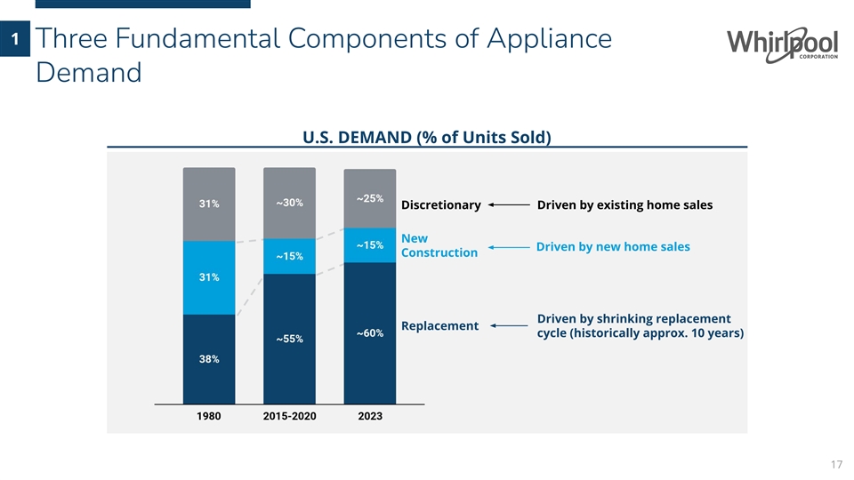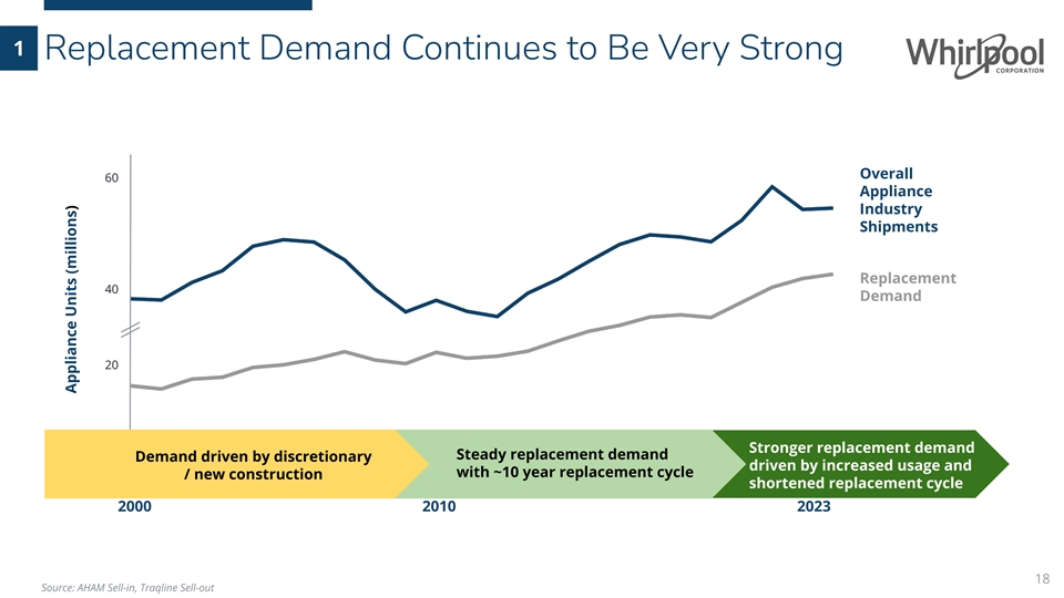 1 Three Fundamental Components of Appliance Demand U.S. DEMAND (% of Units Sold) Discretionary Driven by existing home sales New Driven by new home sales Construction Driven by shrinking replacement Replacement cycle (historically approx. 10 years) 17