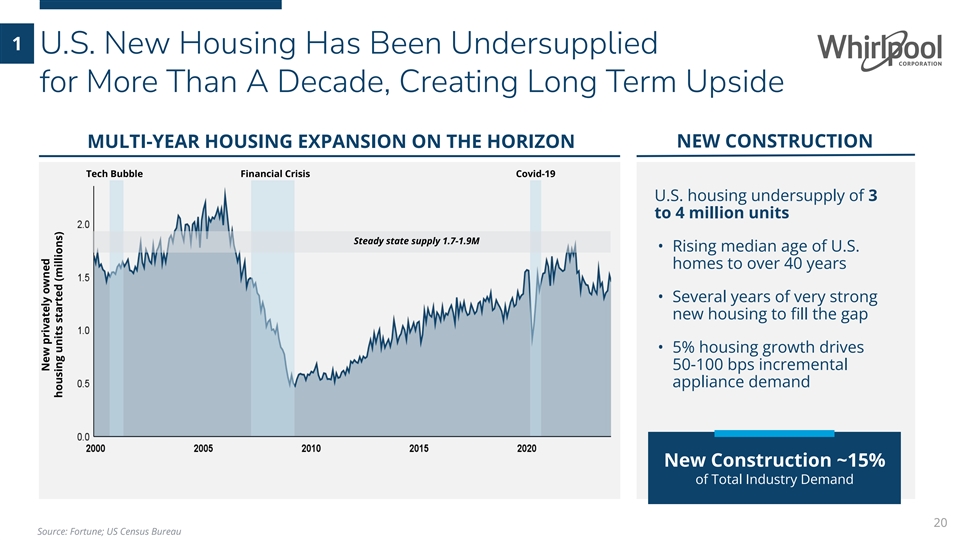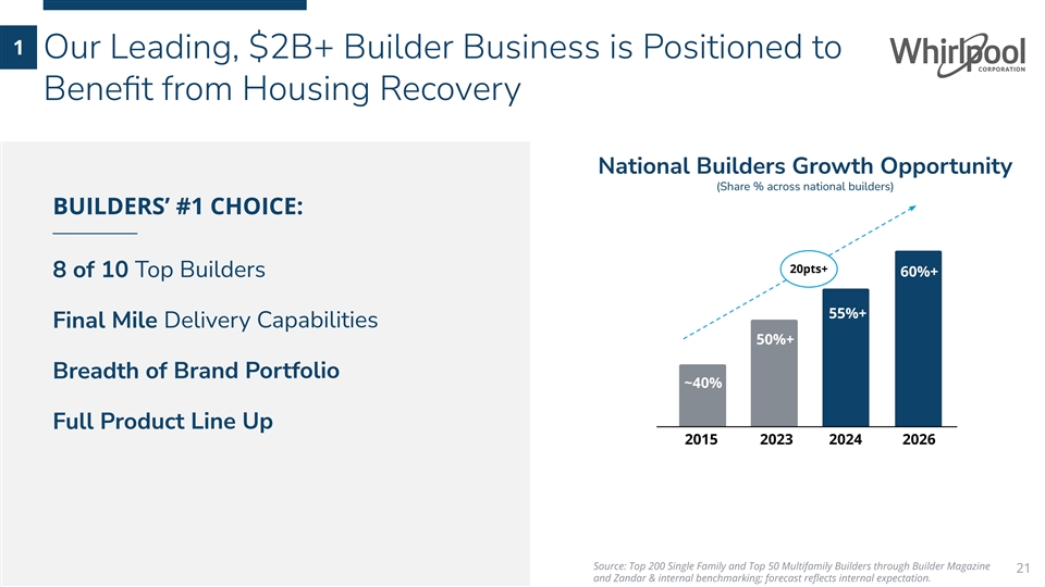 1 U.S. New Housing Has Been Undersupplied for More Than A Decade, Creating Long Term Upside MULTI-YEAR HOUSING EXPANSION ON THE HORIZON NEW CONSTRUCTION Tech Bubble Financial Crisis Covid-19 U.S. housing undersupply of 3 to 4 million units Steady state supply 1.7-1.9M • Rising median age of U.S. homes to over 40 years • Several years of very strong new housing to fill the gap • 5% housing growth drives 50-100 bps incremental appliance demand New Construction ~15% of Total Industry Demand 20 Source: Fortune; US Census Bureau New privately owned housing units started (millions)