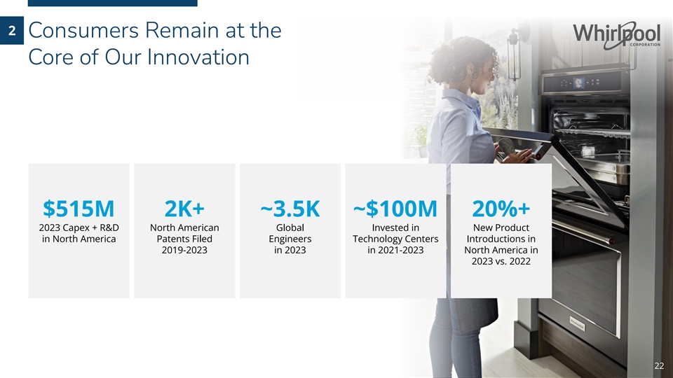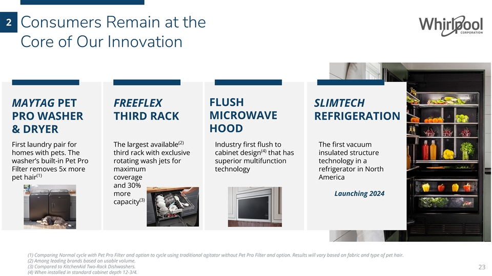 2 Consumers Remain at the Core of Our Innovation $515M 2K+ ~3.5K ~$100M 20%+ 2023 Capex + R&D North American Global Invested in New Product in North America Patents Filed Engineers Technology Centers Introductions in 2019-2023 in 2023 in 2021-2023 North America in 2023 vs. 2022 22 Whirlpool Corporation Confidential