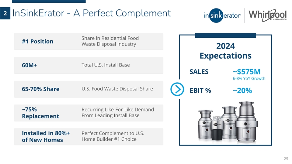 2 InSinkErator - A Perfect Complement Share in Residential Food #1 Position Waste Disposal Industry 2024 Expectations Total U.S. Install Base 60M+ SALES ~$575M 6-8% YoY Growth U.S. Food Waste Disposal Share 65-70% Share EBIT % ~20% ~75% Recurring Like-For-Like Demand From Leading Install Base Replacement Installed in 80%+ Perfect Complement to U.S. Home Builder #1 Choice of New Homes 25