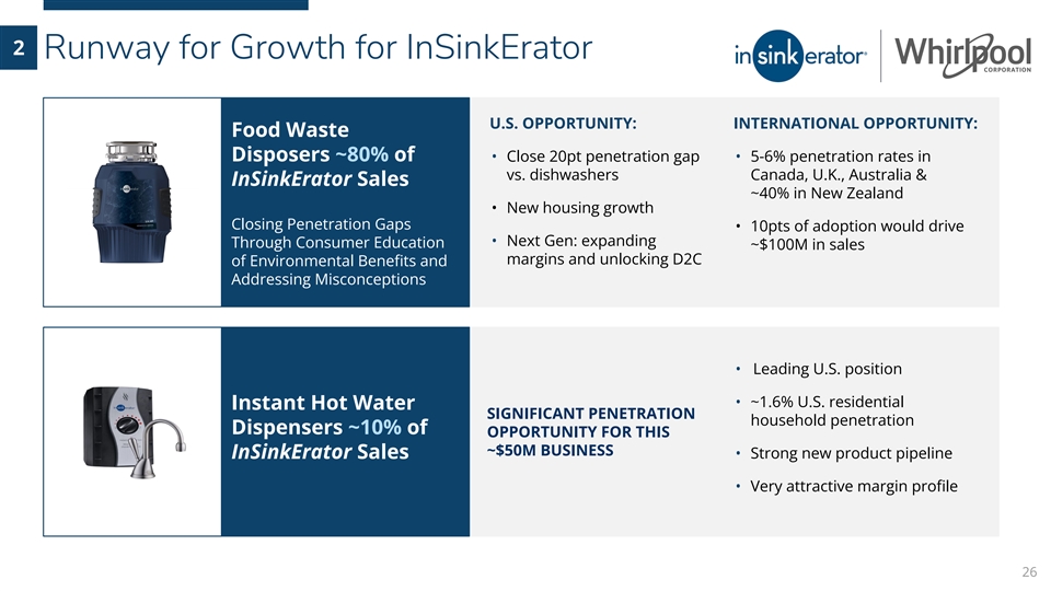 2 Runway for Growth for InSinkErator U.S. OPPORTUNITY: INTERNATIONAL OPPORTUNITY: Food Waste Disposers ~80% of • Close 20pt penetration gap • 5-6% penetration rates in vs. dishwashers Canada, U.K., Australia & InSinkErator Sales ~40% in New Zealand • New housing growth Closing Penetration Gaps • 10pts of adoption would drive • Next Gen: expanding Through Consumer Education ~$100M in sales margins and unlocking D2C of Environmental Benefits and Addressing Misconceptions • Leading U.S. position • ~1.6% U.S. residential Instant Hot Water SIGNIFICANT PENETRATION household penetration Dispensers ~10% of OPPORTUNITY FOR THIS ~$50M BUSINESS • Strong new product pipeline InSinkErator Sales • Very attractive margin profile 26
