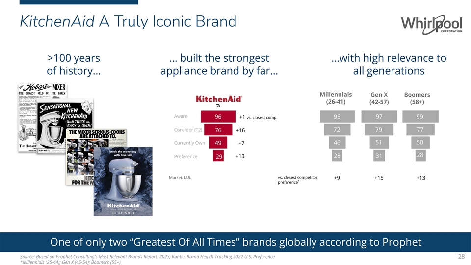 KitchenAid A Truly Iconic Brand >100 years … built the strongest …with high relevance to of history… appliance brand by far… all generations Millennials Gen X Boomers (26-41) (42-57) (58+) % Aware +1 vs. closest comp. 95 97 99 Consider (T2) 72 79 77 +16 Currently Own 46 51 50 +7 28 +13 28 31 Preference vs. closest competitor Market: U.S. +9 +15 +13 * preference One of only two “Greatest Of All Times” brands globally according to Prophet One of only two “Greatest Of All Times” brands globally according to Prophet Source: Based on Prophet Consulting's Most Relevant Brands Report, 2023; Kantar Brand Health Tracking 2022 U.S. Preference 28 *Millennials (25-44); Gen X (45-54); Boomers (55+)