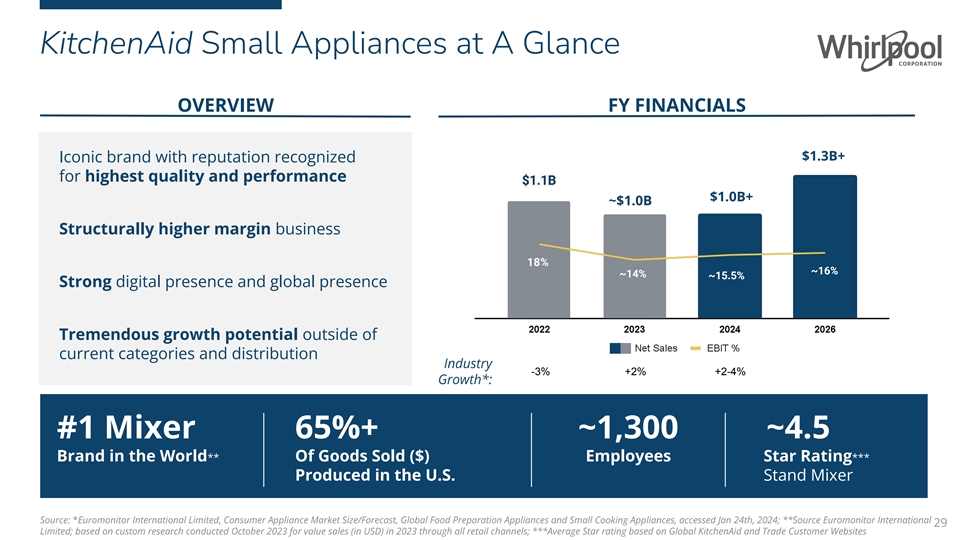 KitchenAid Small Appliances at A Glance OVERVIEW FY FINANCIALS $1.3B+ Iconic brand with reputation recognized for highest quality and performance $1.0B+ ~$1.0B Structurally higher margin business ~16% ~14% ~15.5% Strong digital presence and global presence Tremendous growth potential outside of current categories and distribution Industry -3%+2%+2-4% Growth*: #1 Mixer 65%+ ~1,300 ~4.5 Brand in the World** Of Goods Sold ($) Employees Star Rating*** Produced in the U.S. Stand Mixer Source: *Euromonitor International Limited, Consumer Appliance Market Size/Forecast, Global Food Preparation Appliances and Small Cooking Appliances, accessed Jan 24th, 2024; **Source Euromonitor International 29 Limited; based on custom research conducted October 2023 for value sales (in USD) in 2023 through all retail channels; ***Average Star rating based on Global KitchenAid and Trade Customer Websites