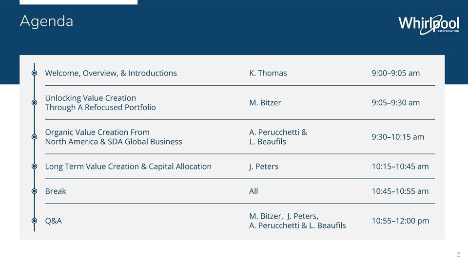 Agenda Welcome, Overview, & Introductions K. Thomas 9:00–9:05 am Unlocking Value Creation M. Bitzer 9:05–9:30 am Through A Refocused Portfolio Organic Value Creation From A. Perucchetti & 9:30–10:15 am North America & SDA Global Business L. Beaufils Long Term Value Creation & Capital Allocation J. Peters 10:15–10:45 am Break All 10:45–10:55 am M. Bitzer, J. Peters, Q&A 10:55–12:00 pm A. Perucchetti & L. Beaufils 2