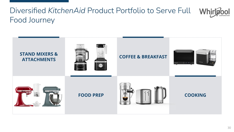 Diversified KitchenAid Product Portfolio to Serve Full Food Journey STAND MIXERS & COFFEE & BREAKFAST ATTACHMENTS FOOD PREP COOKING 30