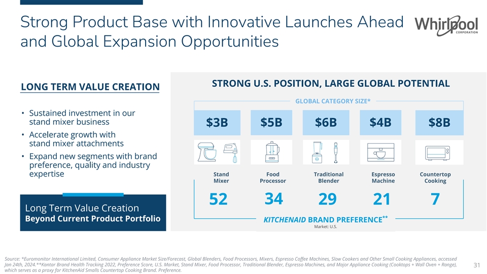 Strong Product Base with Innovative Launches Ahead and Global Expansion Opportunities HIGH PREFERENCE ACROSS ALL MAJOR CATEGORIES STRONG U.S. POSITION, LARGE GLOBAL POTENTIAL LONG TERM VALUE CREATION GLOBAL CATEGORY SIZE* • Sustained investment in our stand mixer business $5B $6B $4B $3B $8B • Accelerate growth with stand mixer attachments • Expand new segments with brand preference, quality and industry expertise Stand Food Traditional Espresso Countertop Mixer Processor Blender Machine Cooking 34 52 29 21 7 Long Term Value Creation ** Beyond Current Product Portfolio KITCHENAID BRAND PREFERENCE Market: U.S. Source: *Euromonitor International Limited, Consumer Appliance Market Size/Forecast, Global Blenders, Food Processors, Mixers, Espresso Coffee Machines, Slow Cookers and Other Small Cooking Appliances, accessed Jan 24th, 2024.**Kantar Brand Health Tracking 2022, Preference Score, U.S. Market, Stand Mixer, Food Processor, Traditional Blender, Espresso Machines, and Major Appliance Cooking (Cooktops + Wall Oven + Range), 31 which serves as a proxy for KitchenAid Smalls Countertop Cooking Brand. Preference.