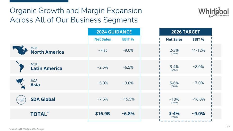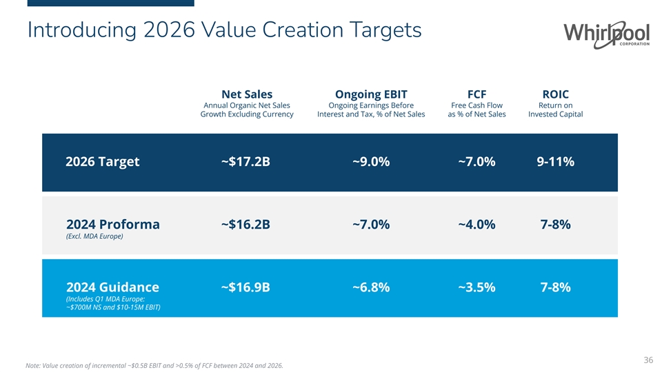 Introducing 2026 Value Creation Targets Net Sales Ongoing EBIT FCF ROIC Annual Organic Net Sales Ongoing Earnings Before Free Cash Flow Return on Growth Excluding Currency Interest and Tax, % of Net Sales as % of Net Sales Invested Capital 2026 Target ~$17.2B ~9.0% ~7.0% 9-11% 2024 Proforma ~$16.2B ~7.0% ~4.0% 7-8% (Excl. MDA Europe) 2024 Guidance ~$16.9B ~6.8% ~3.5% 7-8% (Includes Q1 MDA Europe: ~$700M NS and $10-15M EBIT) 36 Note: Value creation of incremental ~$0.5B EBIT and >0.5% of FCF between 2024 and 2026.
