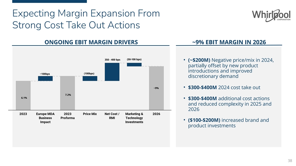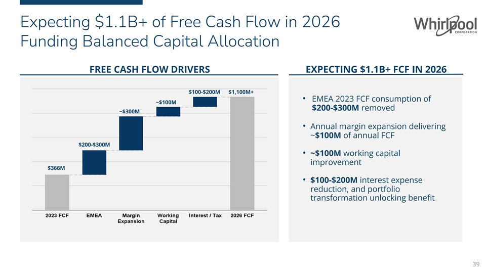 Expecting Margin Expansion From Strong Cost Take Out Actions ONGOING EBIT MARGIN DRIVERS ~9% EBIT MARGIN IN 2026 (50-100 bps) 350 - 400 bps • (~$200M) Negative price/mix in 2024, partially offset by new product introductions and improved (100bps) ~100bps discretionary demand ~9% • $300-$400M 2024 cost take out 7.2% 6.1% • $300-$400M additional cost actions and reduced complexity in 2025 and 2026 • ($100-$200M) increased brand and product investments 38