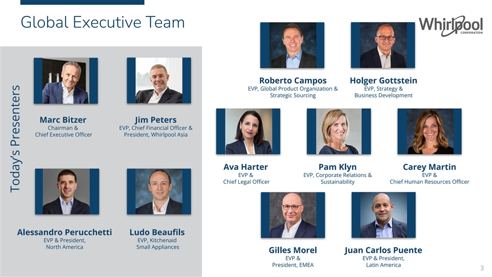Global Executive Team Roberto Campos Holger Gottstein EVP, Global Product Organization & EVP, Strategy & Strategic Sourcing Business Development Marc Bitzer Jim Peters Chairman & EVP, Chief Financial Officer & Chief Executive Officer President, Whirlpool Asia Ava Harter Pam Klyn Carey Martin EVP & EVP, Corporate Relations & EVP & Chief Legal Officer Sustainability Chief Human Resources Officer Alessandro Perucchetti Ludo Beaufils EVP & President, EVP, Kitchenaid North America Small Appliances Gilles Morel Juan Carlos Puente EVP & EVP & President, President, EMEA Latin America 3 Today’s Presenters