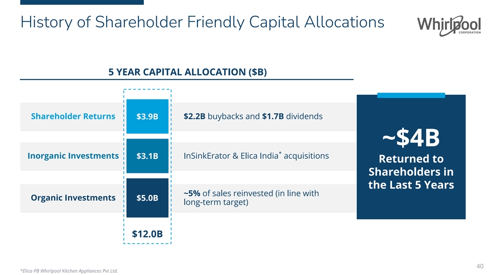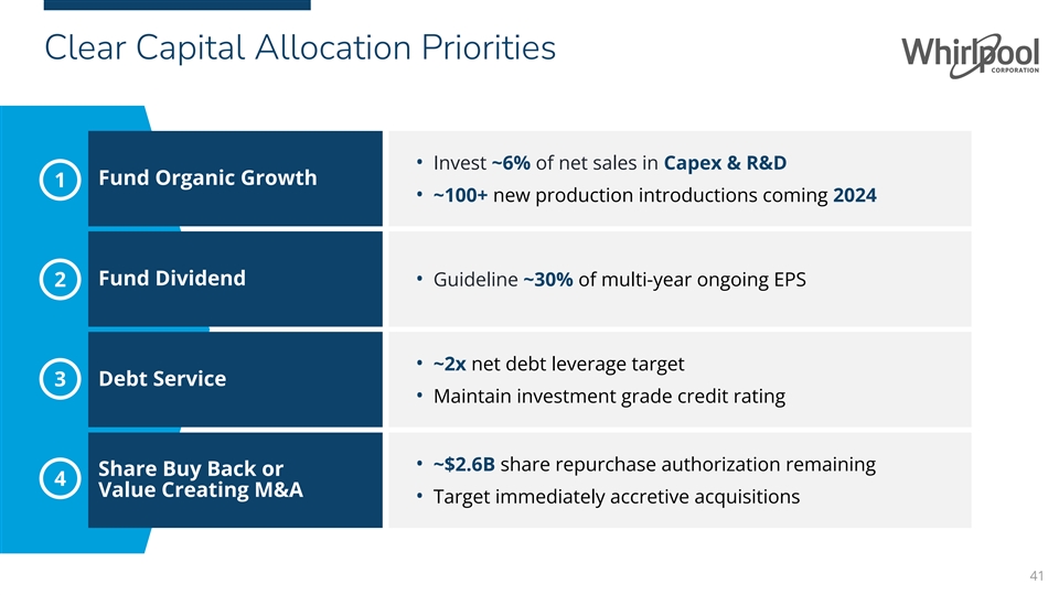 History of Shareholder Friendly Capital Allocations 5 YEAR CAPITAL ALLOCATION ($B) Shareholder Returns $3.9B $2.2B buybacks and $1.7B dividends ~$4B * Inorganic Investments $3.1B InSinkErator & Elica India acquisitions Returned to Shareholders in the Last 5 Years ~5% of sales reinvested (in line with Organic Investments $5.0B long-term target) $12.0B 40 *Elica PB Whirlpool Kitchen Appliances Pvt Ltd.