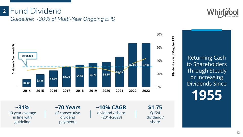 Clear Capital Allocation Priorities • Invest ~6% of net sales in Capex & R&D Fund Organic Growth 1 • ~100+ new production introductions coming 2024 Fund Dividend 2 • Guideline ~30% of multi-year ongoing EPS • ~2x net debt leverage target 3 Debt Service • Maintain investment grade credit rating • ~$2.6B share repurchase authorization remaining Share Buy Back or 4 Value Creating M&A • Target immediately accretive acquisitions 41