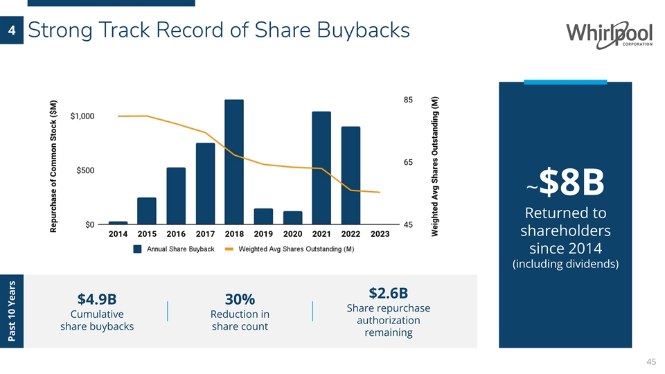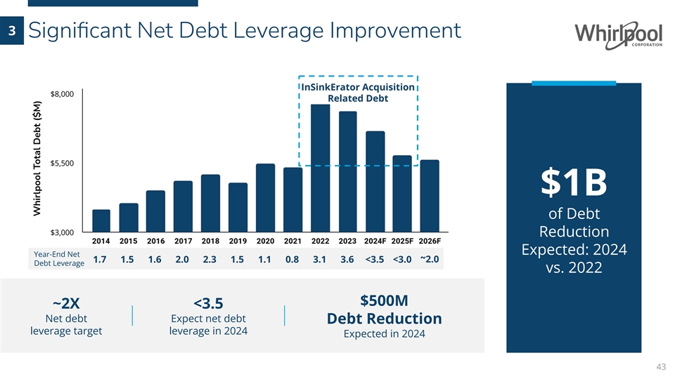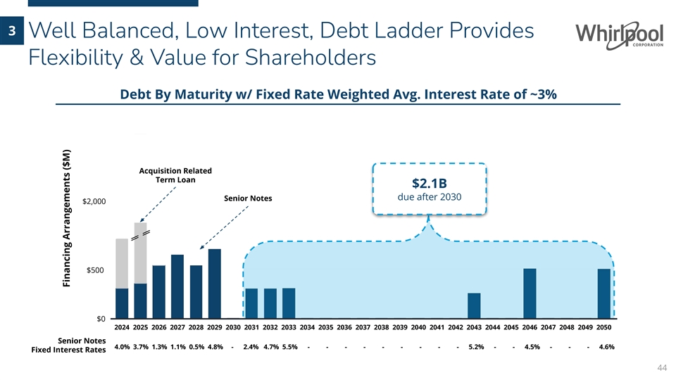 Debt LeverageYear-End Net 3 Significant Net Debt Leverage Improvement InSinkErator Acquisition $8,000 Related Debt $5,500 $1B of Debt $3,000 Reduction Expected: 2024 1.7 1.5 1.6 2.0 2.3 1.5 1.1 0.8 3.1 3.6 <3.5 <3.0~2.0 vs. 2022 $500M ~2X <3.5 Net debt Expect net debt Debt Reduction leverage target leverage in 2024 Expected in 2024 43 Whirlpool Total Debt ($M)