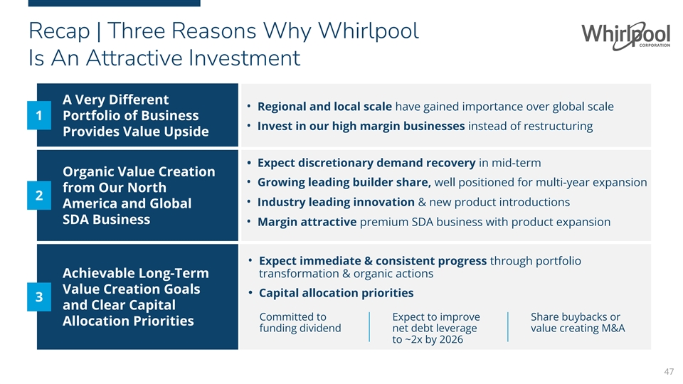 Recap | Three Reasons Why Whirlpool Is An Attractive Investment A Very Different • Regional and local scale have gained importance over global scale 1 Portfolio of Business • Invest in our high margin businesses instead of restructuring Provides Value Upside • Expect discretionary demand recovery in mid-term Organic Value Creation • Growing leading builder share, well positioned for multi-year expansion from Our North 2 • Industry leading innovation & new product introductions America and Global SDA Business • Margin attractive premium SDA business with product expansion • Expect immediate & consistent progress through portfolio Achievable Long-Term transformation & organic actions Value Creation Goals • Capital allocation priorities 3 and Clear Capital Committed to Expect to improve Share buybacks or Allocation Priorities funding dividend net debt leverage value creating M&A to ~2x by 2026 47