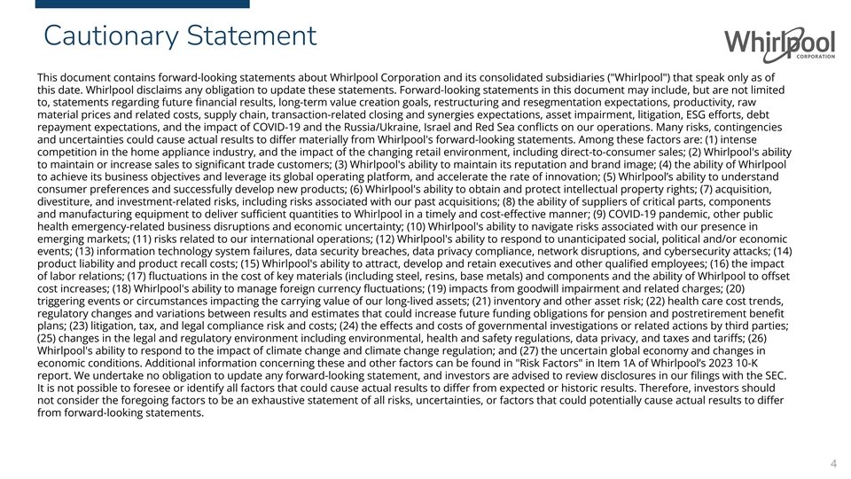 Cautionary Statement This document contains forward-looking statements about Whirlpool Corporation and its consolidated subsidiaries ( Whirlpool ) that speak only as of this date. Whirlpool disclaims any obligation to update these statements. Forward-looking statements in this document may include, but are not limited to, statements regarding future financial results, long-term value creation goals, restructuring and resegmentation expectations, productivity, raw material prices and related costs, supply chain, transaction-related closing and synergies expectations, asset impairment, litigation, ESG efforts, debt repayment expectations, and the impact of COVID-19 and the Russia/Ukraine, Israel and Red Sea conflicts on our operations. Many risks, contingencies and uncertainties could cause actual results to differ materially from Whirlpool's forward-looking statements. Among these factors are: (1) intense competition in the home appliance industry, and the impact of the changing retail environment, including direct-to-consumer sales; (2) Whirlpool's ability to maintain or increase sales to significant trade customers; (3) Whirlpool's ability to maintain its reputation and brand image; (4) the ability of Whirlpool to achieve its business objectives and leverage its global operating platform, and accelerate the rate of innovation; (5) Whirlpool’s ability to understand consumer preferences and successfully develop new products; (6) Whirlpool's ability to obtain and protect intellectual property rights; (7) acquisition, divestiture, and investment-related risks, including risks associated with our past acquisitions; (8) the ability of suppliers of critical parts, components and manufacturing equipment to deliver sufficient quantities to Whirlpool in a timely and cost-effective manner; (9) COVID-19 pandemic, other public health emergency-related business disruptions and economic uncertainty; (10) Whirlpool's ability to navigate risks associated with our presence in emerging markets; (11) risks related to our international operations; (12) Whirlpool's ability to respond to unanticipated social, political and/or economic events; (13) information technology system failures, data security breaches, data privacy compliance, network disruptions, and cybersecurity attacks; (14) product liability and product recall costs; (15) Whirlpool's ability to attract, develop and retain executives and other qualified employees; (16) the impact of labor relations; (17) fluctuations in the cost of key materials (including steel, resins, base metals) and components and the ability of Whirlpool to offset cost increases; (18) Whirlpool's ability to manage foreign currency fluctuations; (19) impacts from goodwill impairment and related charges; (20) triggering events or circumstances impacting the carrying value of our long-lived assets; (21) inventory and other asset risk; (22) health care cost trends, regulatory changes and variations between results and estimates that could increase future funding obligations for pension and postretirement benefit plans; (23) litigation, tax, and legal compliance risk and costs; (24) the effects and costs of governmental investigations or related actions by third parties; (25) changes in the legal and regulatory environment including environmental, health and safety regulations, data privacy, and taxes and tariffs; (26) Whirlpool's ability to respond to the impact of climate change and climate change regulation; and (27) the uncertain global economy and changes in economic conditions. Additional information concerning these and other factors can be found in Risk Factors in Item 1A of Whirlpool’s 2023 10-K report. We undertake no obligation to update any forward-looking statement, and investors are advised to review disclosures in our filings with the SEC. It is not possible to foresee or identify all factors that could cause actual results to differ from expected or historic results. Therefore, investors should not consider the foregoing factors to be an exhaustive statement of all risks, uncertainties, or factors that could potentially cause actual results to differ from forward-looking statements. 4