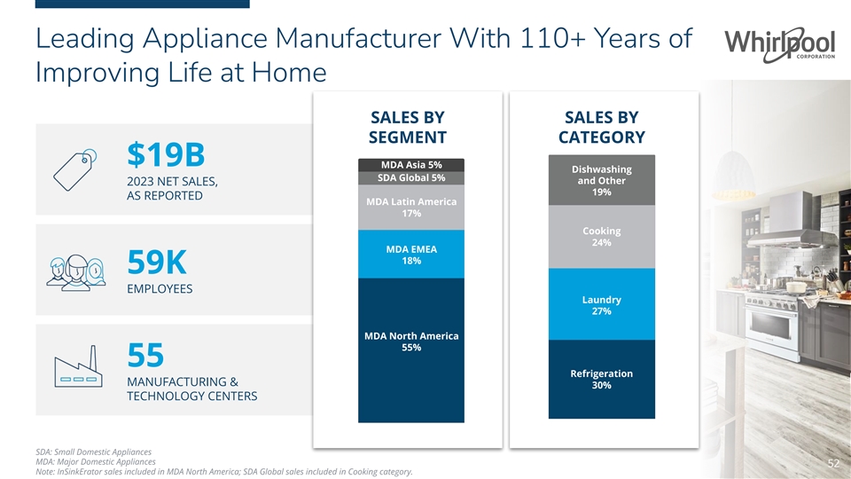 Leading Appliance Manufacturer With 110+ Years of Improving Life at Home SALES BY SALES BY SEGMENT CATEGORY $19B MDA Asia 5% Dishwashing SDA Global 5% and Other 2023 NET SALES, 19% AS REPORTED MDA Latin America 17% Cooking 24% MDA EMEA 18% 59K EMPLOYEES Laundry 27% MDA North America 55% 55 Refrigeration MANUFACTURING & 30% TECHNOLOGY CENTERS SDA: Small Domestic Appliances MDA: Major Domestic Appliances 52 52 Note: InSinkErator sales included in MDA North America; SDA Global sales included in Cooking category.