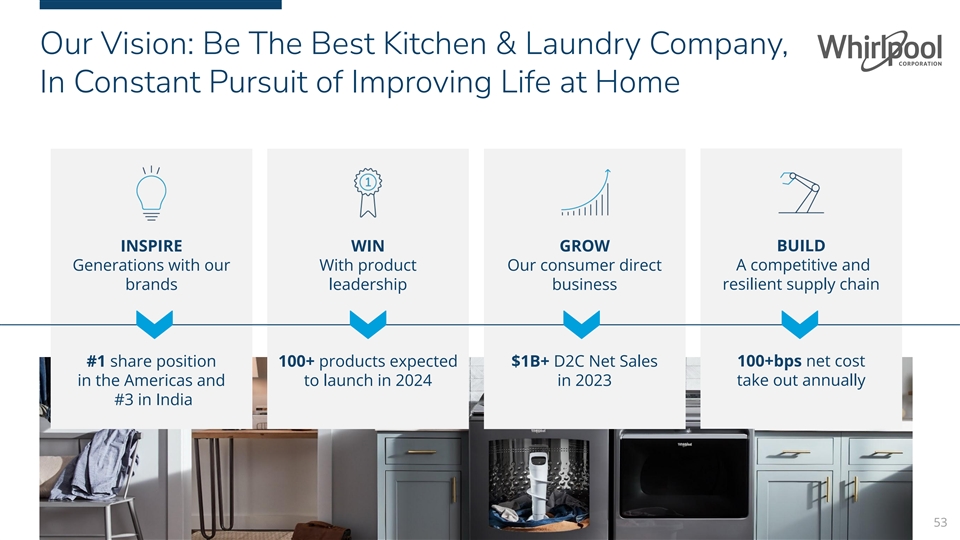 Our Vision: Be The Best Kitchen & Laundry Company, In Constant Pursuit of Improving Life at Home INSPIRE WIN GROW BUILD Generations with our With product Our consumer direct A competitive and resilient supply chain brands leadership business #1 share position 100+ products expected $1B+ D2C Net Sales 100+bps net cost take out annually in the Americas and to launch in 2024 in 2023 #3 in India 53
