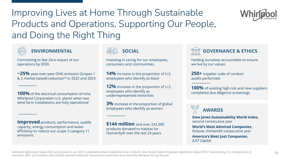 Improving Lives at Home Through Sustainable Products and Operations, Supporting Our People, and Doing the Right Thing ENVIRONMENTAL SOCIAL GOVERNANCE & ETHICS Committing to Net Zero impact of our Investing in caring for our employees, Holding ourselves accountable to ensure operations by 2030. consumers and communities. we live by our values. ~25% year-over-year GHG emission (Scopes 1 14% increase in the proportion of U.S. 250+ supplier code of conduct (a) & 2 market based) reduction in 2022 and 2023 employees who identify as black audits performed 12% increase in the proportion of U.S. 100% of existing high risk and new suppliers employees who identify as completed due diligence screenings 100% of the electrical consumption of nine underrepresented minorities Whirlpool Corporation U.S. plants when two wind farm installations are fully operational 3% increase in the proportion of global employees who identify as women AWARDS Dow Jones Sustainability World Index, second consecutive year Improved products, performance, usable $144 million and over 242,000 capacity, energy consumption and water World’s Most Admired Companies, products donated to Habitat for efficiency to reduce our scope 3 category 11 Fortune, thirteenth consecutive year Humanity® over the last 24 years emissions America’s Most Just Companies, JUST Capital Additional information about ESG can be found in our 2023 Sustainability Report published to be in March. View the full Federal Employer Information Report EEO-1 representing U.S. employees as of 54 December 2022. (a) Emissions data includes divested entities for the period in which they were owned by Whirlpool during the year.