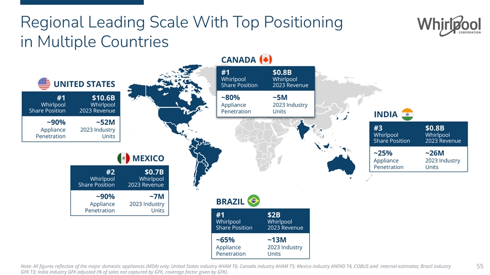 Regional Leading Scale With Top Positioning in Multiple Countries CANADA #1 $0.8B Whirlpool Whirlpool UNITED STATES Share Position 2023 Revenue ~80% ~5M #1 $10.6B Whirlpool Whirlpool Appliance 2023 Industry Share Position 2023 Revenue Penetration Units INDIA ~90% ~52M #3 $0.8B Appliance 2023 Industry Whirlpool Whirlpool Penetration Units Share Position 2023 Revenue ~25% ~26M MEXICO Appliance 2023 Industry Penetration Units #2 $0.7B Whirlpool Whirlpool Share Position 2023 Revenue ~90% ~7M BRAZIL Appliance 2023 Industry Penetration Units #1 $2B Whirlpool Whirlpool Share Position 2023 Revenue ~65% ~13M Appliance 2023 Industry Penetration Units Note: All figures reflective of the major domestic appliances (MDA) only; United States industry AHAM T6; Canada industry AHAM T5; Mexico industry ANFAD T4, COBUS and internal estimates; Brazil industry 55 GFK T3; India industry GFK adjusted (% of sales not captured by GFK, coverage factor given by GFK).