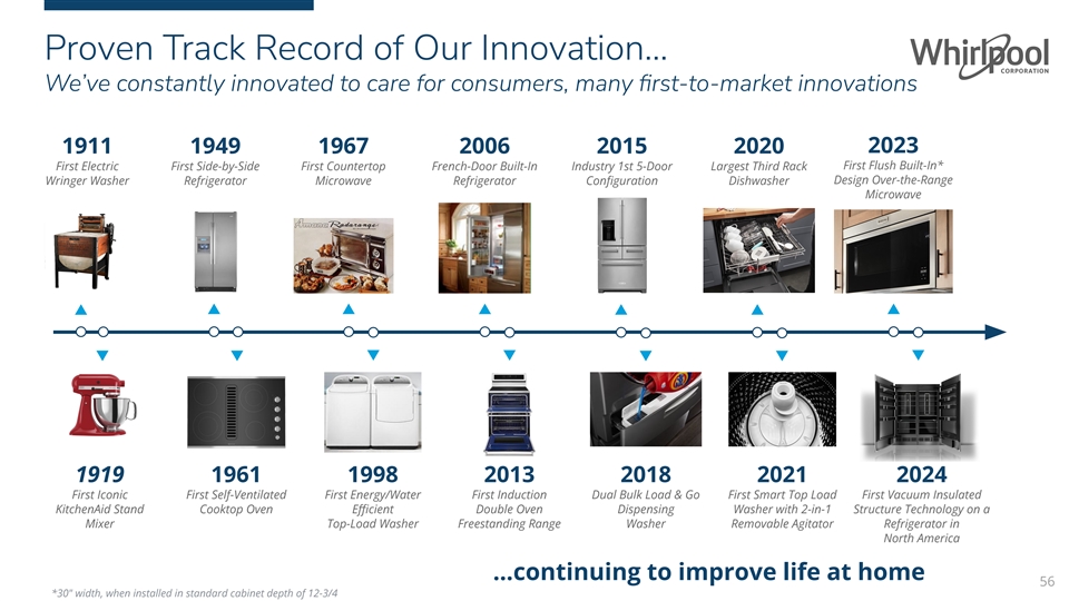 Proven Track Record of Our Innovation… We’ve constantly innovated to care for consumers, many first-to-market innovations 2023 1911 1949 1967 2006 2015 2020 First Electric First Side-by-Side First Countertop French-Door Built-In Industry 1st 5-Door Largest Third Rack First Flush Built-In* Design Over-the-Range Wringer Washer Refrigerator Microwave Refrigerator Configuration Dishwasher Microwave 1919 1961 1998 2013 2018 2021 2024 First Iconic First Self-Ventilated First Energy/Water First Induction Dual Bulk Load & Go First Smart Top Load First Vacuum Insulated KitchenAid Stand Cooktop Oven Efficient Double Oven Dispensing Washer with 2-in-1 Structure Technology on a Mixer Top-Load Washer Freestanding Range Washer Removable Agitator Refrigerator in North America …continuing to improve life at home 56 *30 width, when installed in standard cabinet depth of 12-3/4