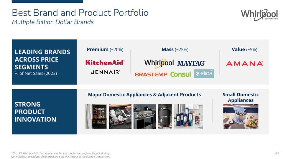 Best Brand and Product Portfolio Multiple Billion Dollar Brands Premium (~20%) Mass (~75%) Value (~5%) LEADING BRANDS ACROSS PRICE SEGMENTS * % of Net Sales (2023) Major Domestic Appliances & Adjacent Products Small Domestic Appliances STRONG PRODUCT INNOVATION *Elica PB Whirlpool Kitchen Appliances Pvt Ltd. Under license from Elica SpA, Italy. 57 Note: Reflects brand portfolio expected post the closing of the Europe transaction.