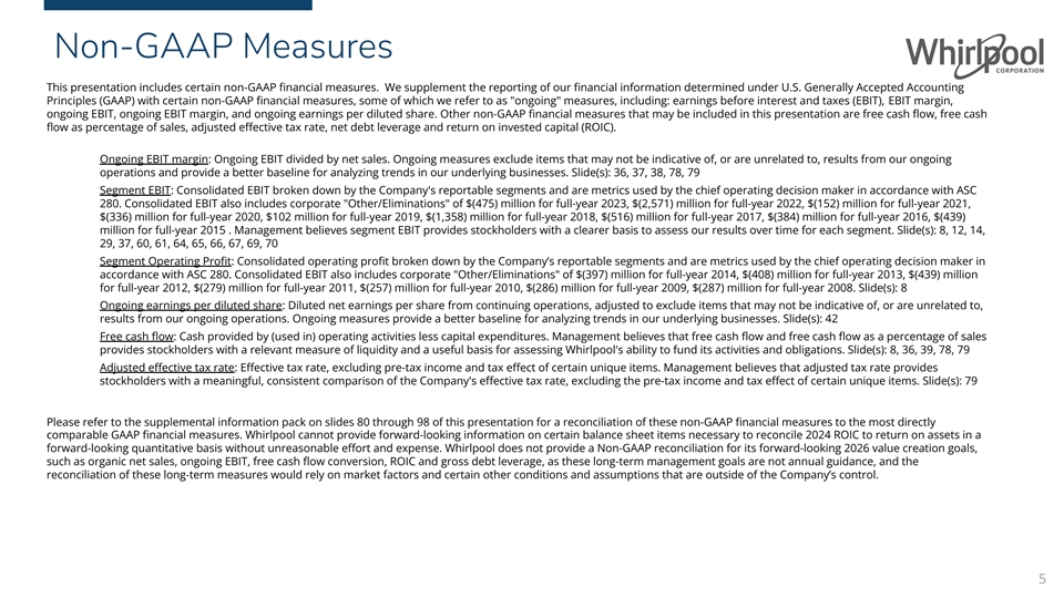 Non-GAAP Measures This presentation includes certain non-GAAP financial measures. We supplement the reporting of our financial information determined under U.S. Generally Accepted Accounting Principles (GAAP) with certain non-GAAP financial measures, some of which we refer to as ongoing measures, including: earnings before interest and taxes (EBIT), EBIT margin, ongoing EBIT, ongoing EBIT margin, and ongoing earnings per diluted share. Other non-GAAP financial measures that may be included in this presentation are free cash flow, free cash flow as percentage of sales, adjusted effective tax rate, net debt leverage and return on invested capital (ROIC). Ongoing EBIT margin: Ongoing EBIT divided by net sales. Ongoing measures exclude items that may not be indicative of, or are unrelated to, results from our ongoing operations and provide a better baseline for analyzing trends in our underlying businesses. Slide(s): 36, 37, 38, 78, 79 Segment EBIT: Consolidated EBIT broken down by the Company's reportable segments and are metrics used by the chief operating decision maker in accordance with ASC 280. Consolidated EBIT also includes corporate Other/Eliminations of $(475) million for full-year 2023, $(2,571) million for full-year 2022, $(152) million for full-year 2021, $(336) million for full-year 2020, $102 million for full-year 2019, $(1,358) million for full-year 2018, $(516) million for full-year 2017, $(384) million for full-year 2016, $(439) million for full-year 2015 . Management believes segment EBIT provides stockholders with a clearer basis to assess our results over time for each segment. Slide(s): 8, 12, 14, 29, 37, 60, 61, 64, 65, 66, 67, 69, 70 Segment Operating Profit: Consolidated operating profit broken down by the Company’s reportable segments and are metrics used by the chief operating decision maker in accordance with ASC 280. Consolidated EBIT also includes corporate Other/Eliminations of $(397) million for full-year 2014, $(408) million for full-year 2013, $(439) million for full-year 2012, $(279) million for full-year 2011, $(257) million for full-year 2010, $(286) million for full-year 2009, $(287) million for full-year 2008. Slide(s): 8 Ongoing earnings per diluted share: Diluted net earnings per share from continuing operations, adjusted to exclude items that may not be indicative of, or are unrelated to, results from our ongoing operations. Ongoing measures provide a better baseline for analyzing trends in our underlying businesses. Slide(s): 42 Free cash flow: Cash provided by (used in) operating activities less capital expenditures. Management believes that free cash flow and free cash flow as a percentage of sales provides stockholders with a relevant measure of liquidity and a useful basis for assessing Whirlpool's ability to fund its activities and obligations. Slide(s): 8, 36, 39, 78, 79 Adjusted effective tax rate: Effective tax rate, excluding pre-tax income and tax effect of certain unique items. Management believes that adjusted tax rate provides stockholders with a meaningful, consistent comparison of the Company's effective tax rate, excluding the pre-tax income and tax effect of certain unique items. Slide(s): 79 Please refer to the supplemental information pack on slides 80 through 98 of this presentation for a reconciliation of these non-GAAP financial measures to the most directly comparable GAAP financial measures. Whirlpool cannot provide forward-looking information on certain balance sheet items necessary to reconcile 2024 ROIC to return on assets in a forward-looking quantitative basis without unreasonable effort and expense. Whirlpool does not provide a Non-GAAP reconciliation for its forward-looking 2026 value creation goals, such as organic net sales, ongoing EBIT, free cash flow conversion, ROIC and gross debt leverage, as these long-term management goals are not annual guidance, and the reconciliation of these long-term measures would rely on market factors and certain other conditions and assumptions that are outside of the Company’s control. 5