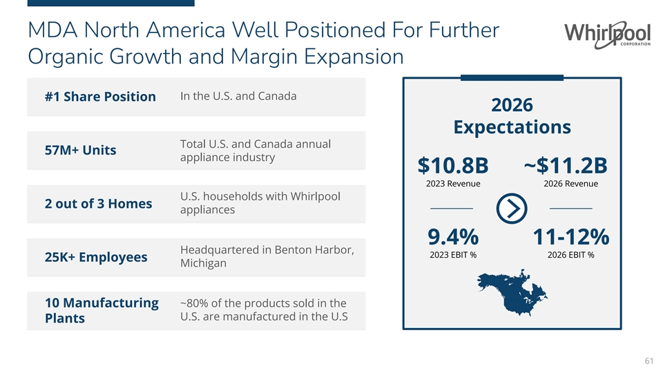 MDA North America Well Positioned For Further Organic Growth and Margin Expansion In the U.S. and Canada #1 Share Position 2026 Expectations Total U.S. and Canada annual 57M+ Units appliance industry $10.8B ~$11.2B 2023 Revenue 2026 Revenue U.S. households with Whirlpool 2 out of 3 Homes appliances 9.4% 11-12% Headquartered in Benton Harbor, 2023 EBIT % 2026 EBIT % 25K+ Employees Michigan 10 Manufacturing ~80% of the products sold in the U.S. are manufactured in the U.S Plants 61