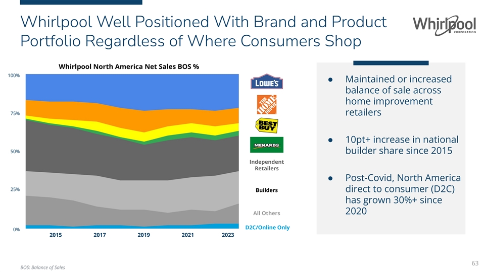 Whirlpool Well Positioned With Brand and Product Portfolio Regardless of Where Consumers Shop Whirlpool North America Net Sales BOS % 100% ● Maintained or increased balance of sale across home improvement 75% retailers ● 10pt+ increase in national 50% builder share since 2015 Independent Retailers ● Post-Covid, North America 25% Builders direct to consumer (D2C) has grown 30%+ since 2020 All Others D2C/Online Only 0% 2015 2017 2019 2021 2023 63 BOS: Balance of Sales