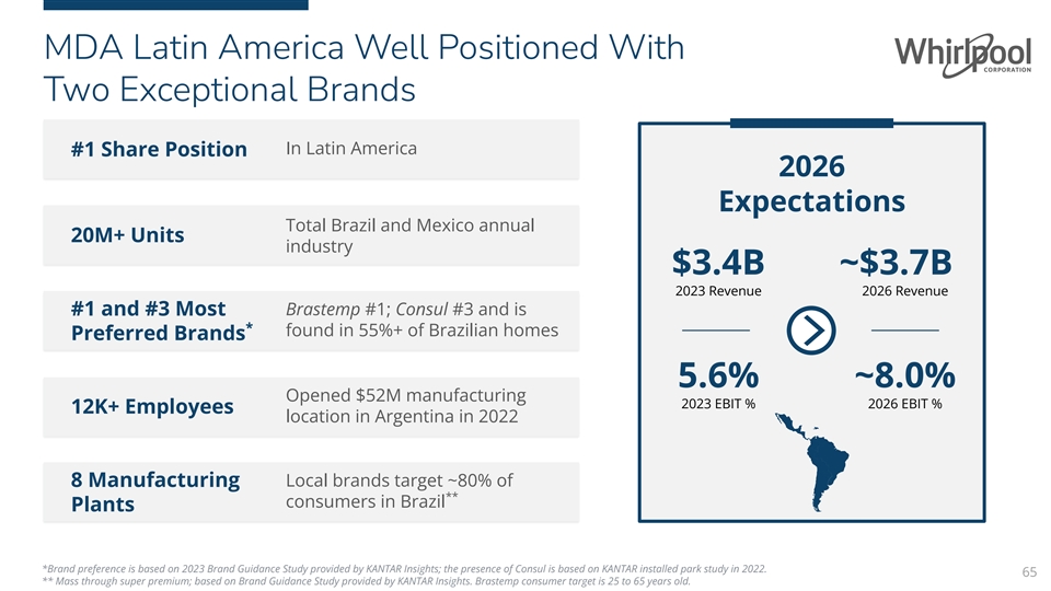 MDA Latin America | Segment Overview REVENUE ($B) EBIT (%) 2023 REVENUE BY PRODUCT LEADING BRAND PORTFOLIO 14% 44% Dishwashing * Refrigeration and Other 13% 29% Cooking Laundry 64 *Other includes spare parts, water filters and subscriptions, air conditioning.