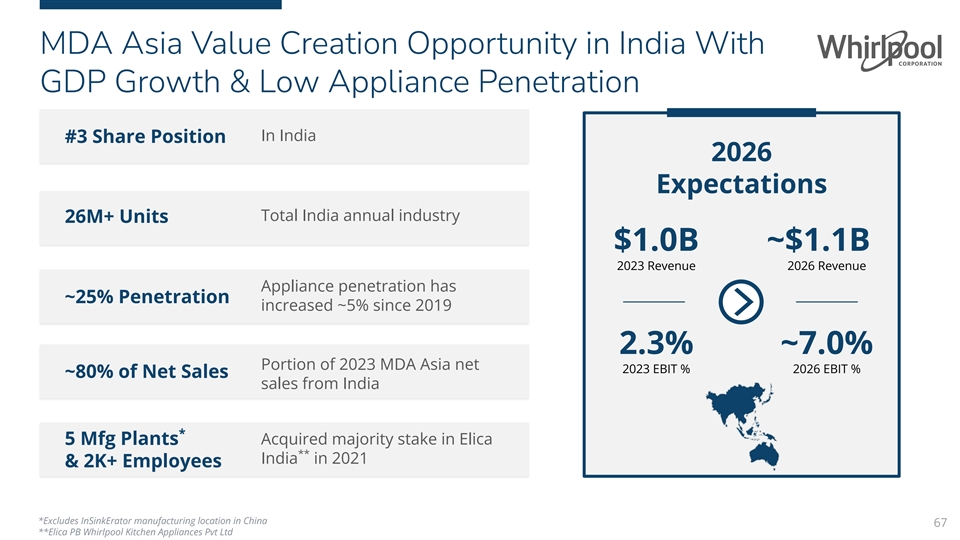 MDA Asia Value Creation Opportunity in India With GDP Growth & Low Appliance Penetration In India #3 Share Position 2026 Expectations Total India annual industry 26M+ Units $1.0B ~$1.1B 2023 Revenue 2026 Revenue Appliance penetration has ~25% Penetration increased ~5% since 2019 2.3% ~7.0% Portion of 2023 MDA Asia net 2023 EBIT % 2026 EBIT % ~80% of Net Sales sales from India * 5 Mfg Plants Acquired majority stake in Elica ** India in 2021 & 2K+ Employees *Excludes InSinkErator manufacturing location in China 67 **Elica PB Whirlpool Kitchen Appliances Pvt Ltd
