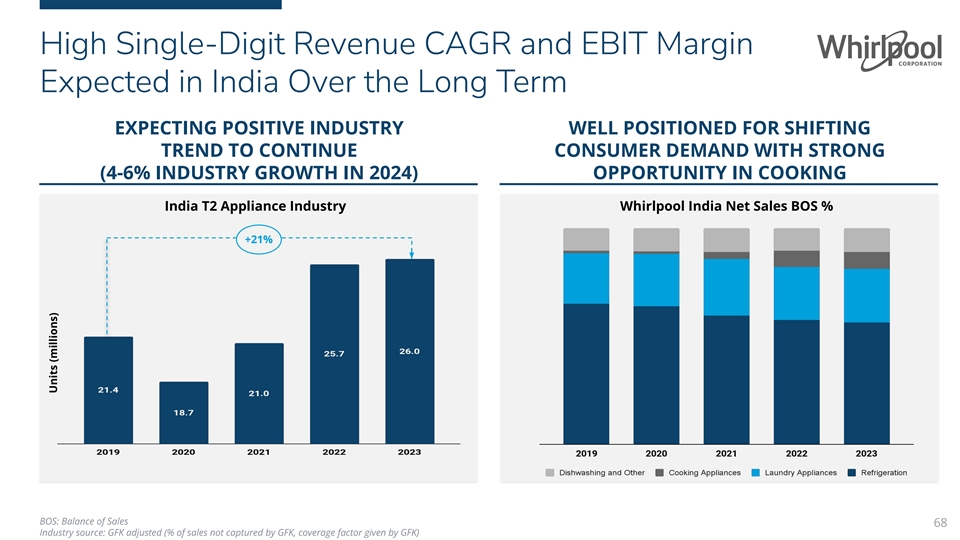 High Single-Digit Revenue CAGR and EBIT Margin Expected in India Over the Long Term EXPECTING POSITIVE INDUSTRY WELL POSITIONED FOR SHIFTING TREND TO CONTINUE CONSUMER DEMAND WITH STRONG (4-6% INDUSTRY GROWTH IN 2024) OPPORTUNITY IN COOKING India T2 Appliance Industry Whirlpool India Net Sales BOS % +21% BOS: Balance of Sales 68 Industry source: GFK adjusted (% of sales not captured by GFK, coverage factor given by GFK) Units (millions)