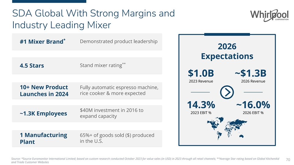 SDA Global With Strong Margins and Industry Leading Mixer * Demonstrated product leadership #1 Mixer Brand 2026 Expectations ** Stand mixer rating 4.5 Stars $1.0B ~$1.3B 2023 Revenue 2026 Revenue 10+ New Product Fully automatic espresso machine, rice cooker & more expected Launches in 2024 14.3% ~16.0% $40M investment in 2016 to 2023 EBIT % 2026 EBIT % ~1.3K Employees expand capacity 65%+ of goods sold ($) produced 1 Manufacturing in the U.S. Plant Source: *Source Euromonitor International Limited; based on custom research conducted October 2023 for value sales (in USD) in 2023 through all retail channels; **Average Star rating based on Global KitchenAid 70 and Trade Customer Websites