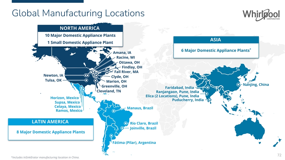 Global Manufacturing Locations NORTH AMERICA 10 Major Domestic Appliance Plants ASIA 1 Small Domestic Appliance Plant * 6 Major Domestic Appliance Plants Amana, IA Racine, WI Ottawa, OH Findlay, OH Fall River, MA Newton, IA Clyde, OH Tulsa, OK Marion, OH Nanjing, China Greenville, OH Faridabad, India Cleveland, TN Ranjangaon, Pune, India Elica (2 Locations), Pune, India Horizon, Mexico Puducherry, India Supsa, Mexico Celaya, Mexico Manaus, Brazil Ramos, Mexico LATIN AMERICA Rio Claro, Brazil Joinville, Brazil 8 Major Domestic Appliance Plants Fátima (Pilar), Argentina 72 *Includes InSinkErator manufacturing location in China.