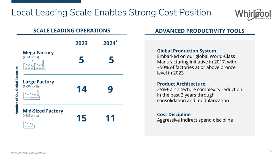 Need information Local Leading Scale Enables Strong Cost Position SCALE LEADING OPERATIONS ADVANCED PRODUCTIVITY TOOLS * 2023 2024 Global Production System Mega Factory (>3M units) Embarked on our global World-Class 5 5 Manufacturing initiative in 2017, with ~50% of factories at or above bronze level in 2023 Large Factory Product Architecture (1–3M units) 25%+ architecture complexity reduction 14 9 in the past 3 years through consolidation and modularization Mid-Sized Factory Cost Discipline (<1M units) 15 11 Aggressive indirect spend discipline 73 *Excludes MDA EMEA factories. Ready for design Suggest introducing a map slide after or before (lets see what that slide looks like) combining pp. 15, 22, 27 Number of Key Global Factories