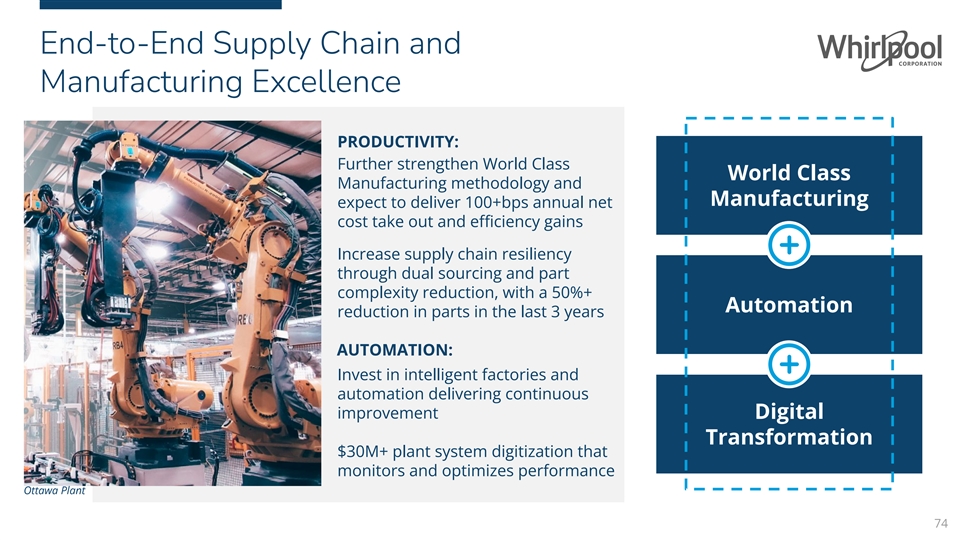 End-to-End Supply Chain and Manufacturing Excellence PRODUCTIVITY: Further strengthen World Class World Class Manufacturing methodology and Manufacturing expect to deliver 100+bps annual net cost take out and efficiency gains Increase supply chain resiliency through dual sourcing and part complexity reduction, with a 50%+ Automation reduction in parts in the last 3 years AUTOMATION: Invest in intelligent factories and automation delivering continuous improvement Digital Transformation $30M+ plant system digitization that monitors and optimizes performance Ottawa Plant 74