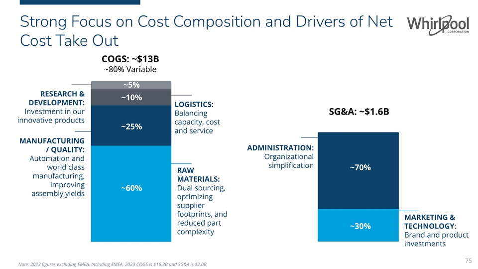 Strong Focus on Cost Composition and Drivers of Net Cost Take Out COGS: ~$13B ~80% Variable ~5% RESEARCH & ~10% DEVELOPMENT: LOGISTICS: Investment in our SG&A: ~$1.6B Balancing innovative products capacity, cost ~25% and service MANUFACTURING ADMINISTRATION: / QUALITY: Organizational Automation and simplification world class ~70% RAW manufacturing, MATERIALS: improving Dual sourcing, ~60% assembly yields optimizing supplier footprints, and MARKETING & reduced part ~30% TECHNOLOGY: complexity Brand and product investments 75 Note: 2023 figures excluding EMEA. Including EMEA, 2023 COGS is $16.3B and SG&A is $2.0B.