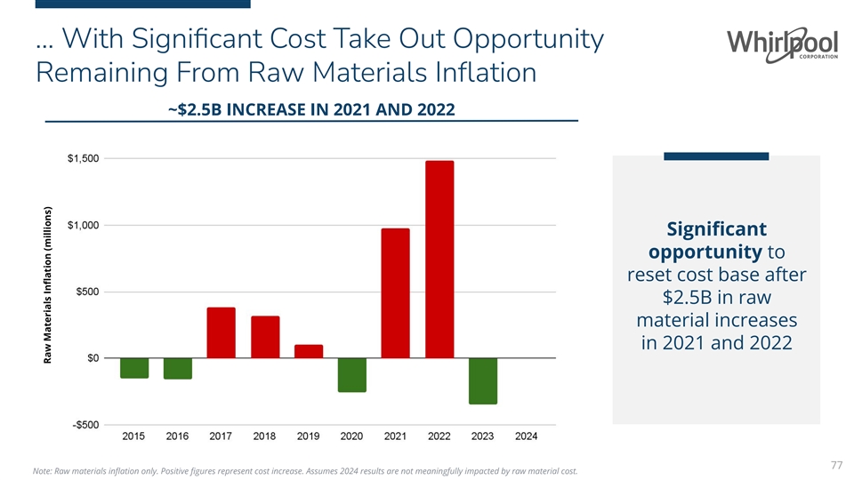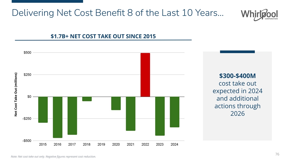 Delivering Net Cost Benefit 8 of the Last 10 Years… $1.7B+ NET COST TAKE OUT SINCE 2015 $300-$400M cost take out expected in 2024 and additional actions through 2026 76 Note: Net cost take out only. Negative figures represent cost reduction. Net Cost Take Out (millions)