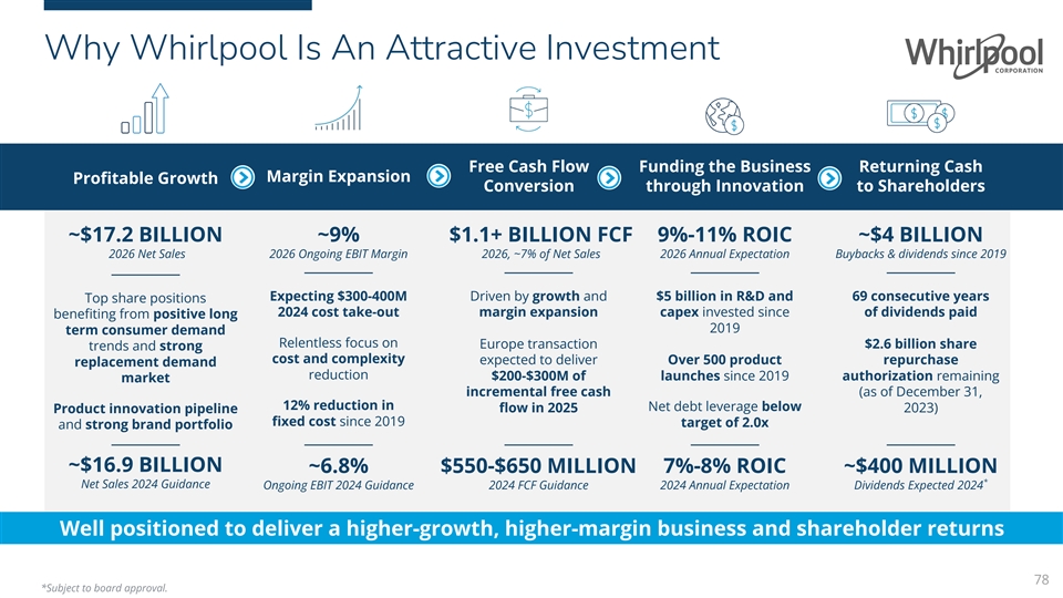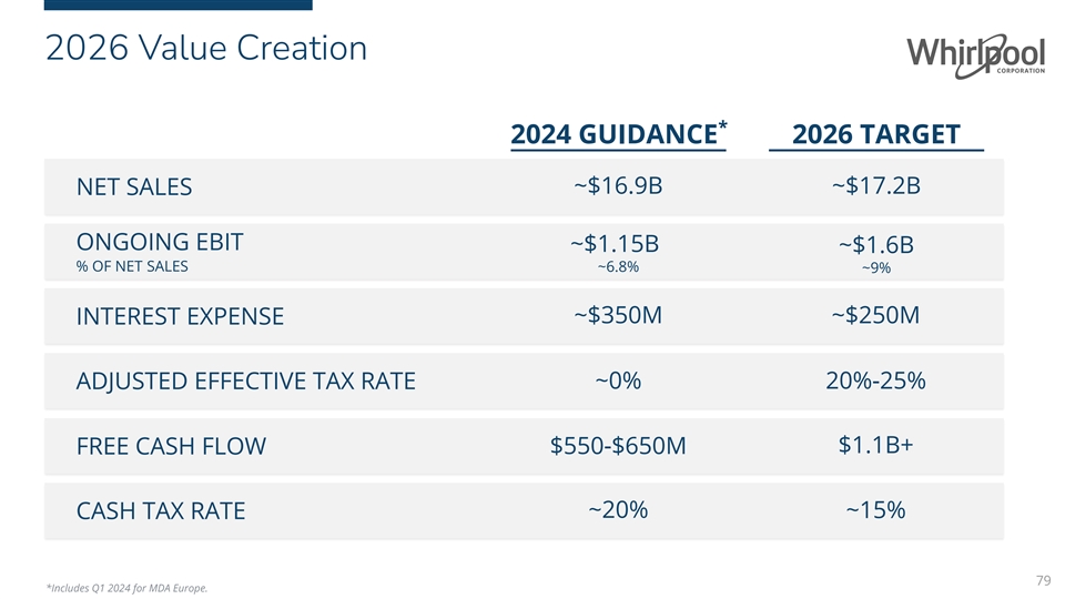 Why Whirlpool Is An Attractive Investment Free Cash Flow Funding the Business Returning Cash Margin Expansion Profitable Growth Conversion through Innovation to Shareholders ~$17.2 BILLION ~9% $1.1+ BILLION FCF 9%-11% ROIC ~$4 BILLION 2026 Net Sales 2026 Ongoing EBIT Margin 2026, ~7% of Net Sales 2026 Annual Expectation Buybacks & dividends since 2019 Expecting $300-400M Driven by growth and $5 billion in R&D and 69 consecutive years Top share positions 2024 cost take-out margin expansion capex invested since of dividends paid benefiting from positive long 2019 term consumer demand Relentless focus on Europe transaction $2.6 billion share trends and strong cost and complexity expected to deliver Over 500 product repurchase replacement demand reduction $200-$300M of launches since 2019 authorization remaining market incremental free cash (as of December 31, 12% reduction in flow in 2025 Net debt leverage below 2023) Product innovation pipeline fixed cost since 2019 target of 2.0x and strong brand portfolio ~$16.9 BILLION ~6.8% $550-$650 MILLION 7%-8% ROIC ~$400 MILLION * Net Sales 2024 Guidance Ongoing EBIT 2024 Guidance 2024 FCF Guidance 2024 Annual Expectation Dividends Expected 2024 Well positioned to deliver a higher-growth, higher-margin business and shareholder returns 78 *Subject to board approval.