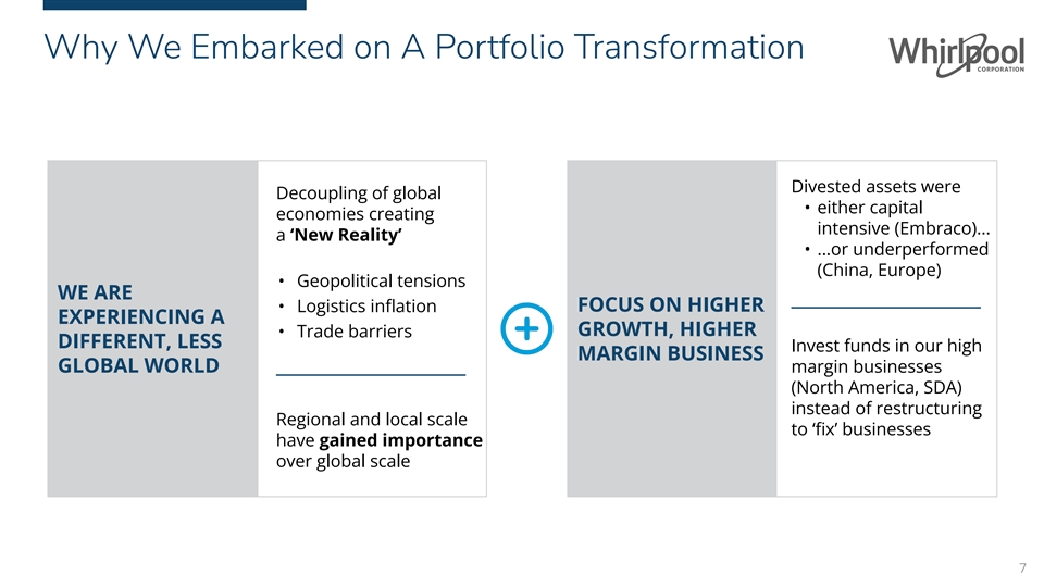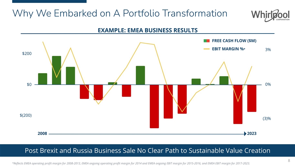 Why We Embarked on A Portfolio Transformation Divested assets were Decoupling of global • either capital economies creating intensive (Embraco)... a ‘New Reality’ • …or underperformed (China, Europe) • Geopolitical tensions WE ARE FOCUS ON HIGHER • Logistics inflation EXPERIENCING A GROWTH, HIGHER • Trade barriers DIFFERENT, LESS Invest funds in our high MARGIN BUSINESS GLOBAL WORLD margin businesses (North America, SDA) instead of restructuring Regional and local scale to ‘fix’ businesses have gained importance over global scale 7