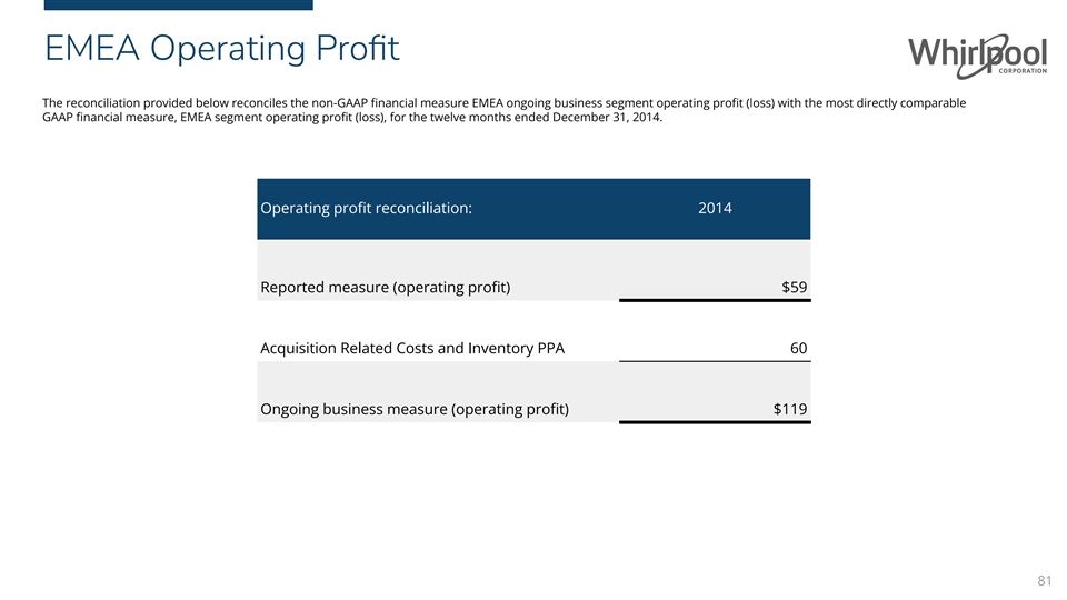 EMEA Operating Profit The reconciliation provided below reconciles the non-GAAP financial measure EMEA ongoing business segment operating profit (loss) with the most directly comparable GAAP financial measure, EMEA segment operating profit (loss), for the twelve months ended December 31, 2014. Operating profit reconciliation: 2014 Reported measure (operating profit) $59 Acquisition Related Costs and Inventory PPA 60 Ongoing business measure (operating profit) $119 81