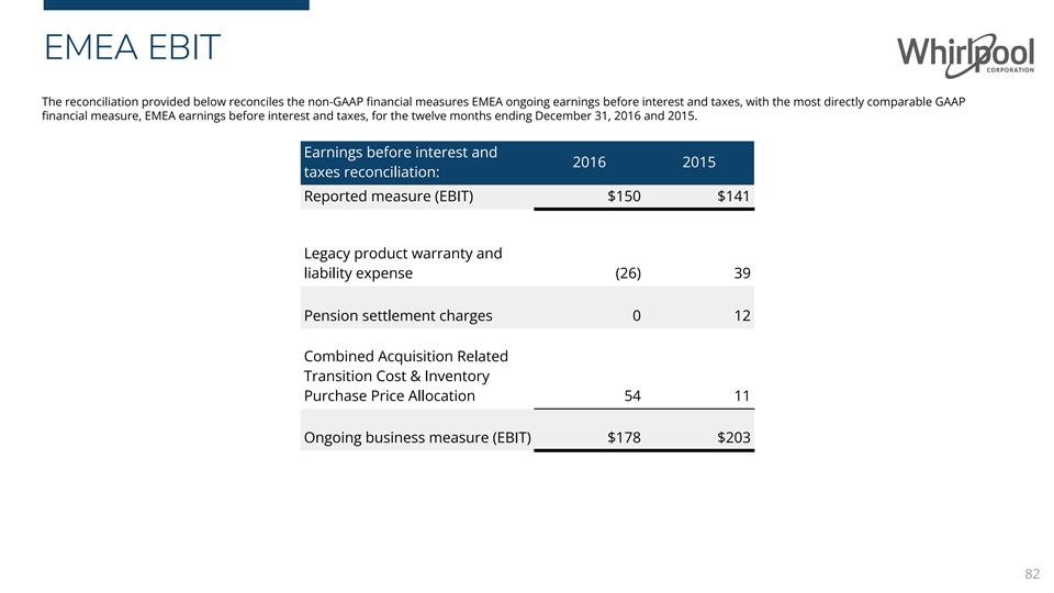 EMEA EBIT The reconciliation provided below reconciles the non-GAAP financial measures EMEA ongoing earnings before interest and taxes, with the most directly comparable GAAP financial measure, EMEA earnings before interest and taxes, for the twelve months ending December 31, 2016 and 2015. Earnings before interest and 2016 2015 taxes reconciliation: Reported measure (EBIT) $150 $141 Legacy product warranty and liability expense (26) 39 Pension settlement charges 0 12 Combined Acquisition Related Transition Cost & Inventory Purchase Price Allocation 54 11 Ongoing business measure (EBIT) $178 $203 82