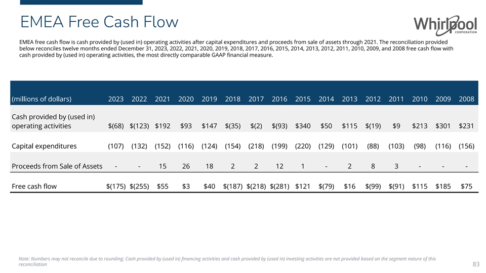 EMEA Free Cash Flow EMEA free cash flow is cash provided by (used in) operating activities after capital expenditures and proceeds from sale of assets through 2021. The reconciliation provided below reconciles twelve months ended December 31, 2023, 2022, 2021, 2020, 2019, 2018, 2017, 2016, 2015, 2014, 2013, 2012, 2011, 2010, 2009, and 2008 free cash flow with cash provided by (used in) operating activities, the most directly comparable GAAP financial measure. (millions of dollars) 2023 2022 2021 2020 2019 2018 2017 2016 2015 2014 2013 2012 2011 2010 2009 2008 Cash provided by (used in) operating activities $(68) $(123) $192 $93 $147 $(35) $(2) $(93) $340 $50 $115 $(19) $9 $213 $301 $231 Capital expenditures (107) (132) (152) (116) (124) (154) (218) (199) (220) (129) (101) (88) (103) (98) (116) (156) Proceeds from Sale of Assets - - 15 26 18 2 2 12 1 - 2 8 3 - - - Free cash flow $(175) $(255) $55 $3 $40 $(187) $(218) $(281) $121 $(79) $16 $(99) $(91) $115 $185 $75 Note: Numbers may not reconcile due to rounding; Cash provided by (used in) financing activities and cash provided by (used in) investing activities are not provided based on the segment nature of this reconciliation 83