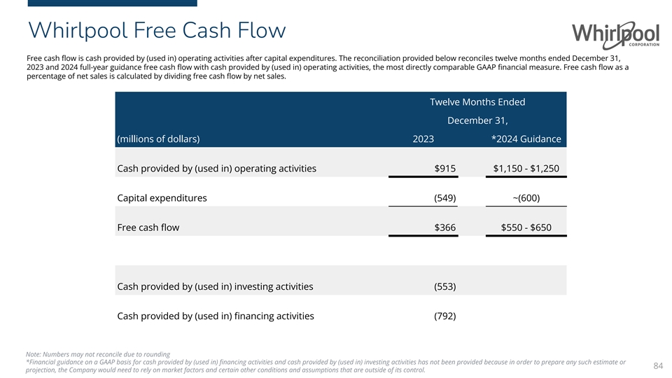Whirlpool Free Cash Flow Free cash flow is cash provided by (used in) operating activities after capital expenditures. The reconciliation provided below reconciles twelve months ended December 31, 2023 and 2024 full-year guidance free cash flow with cash provided by (used in) operating activities, the most directly comparable GAAP financial measure. Free cash flow as a percentage of net sales is calculated by dividing free cash flow by net sales. Twelve Months Ended December 31, (millions of dollars) 2023 *2024 Guidance Cash provided by (used in) operating activities $915 $1,150 - $1,250 Capital expenditures (549) ~(600) Free cash flow $366 $550 - $650 Cash provided by (used in) investing activities (553) Cash provided by (used in) financing activities (792) Note: Numbers may not reconcile due to rounding *Financial guidance on a GAAP basis for cash provided by (used in) financing activities and cash provided by (used in) investing activities has not been provided because in order to prepare any such estimate or 84 projection, the Company would need to rely on market factors and certain other conditions and assumptions that are outside of its control.